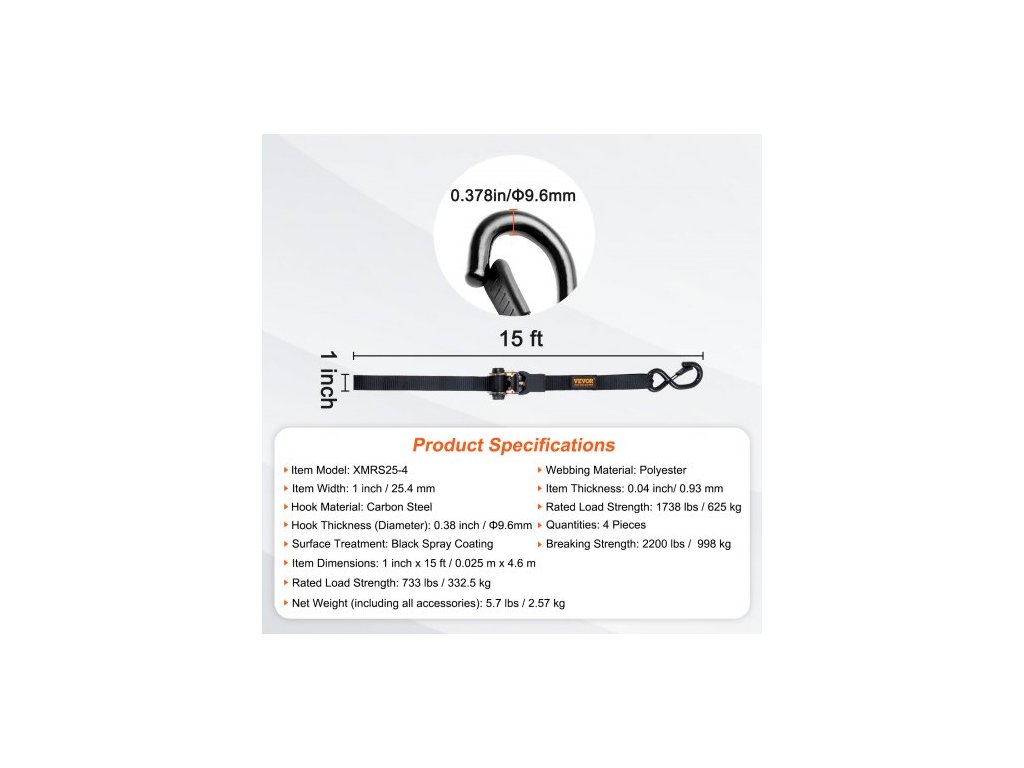 Jmenovitá nosnost: 733 lb / 332,5 kg,Model položky: XMRS25-4,Tloušťka položky: 0,04 palce / 0,93 mm,Materiál háku: Uhlíková ocel,Čistá hmotnost (včetně veškerého příslušenství): 5,7 lb / 2,57 kg,Mez pevnosti v tahu: 2200 lb / 998 kg,Povrchová úprava:Černý nástřik,Tloušťka háku (průměr): 0,38 palce / Φ9,6 mm,Rozměry položky: 1 palec x 15 stop / 0,025 m x 4,6 m, Množství: 4 kusy, Šířka položky: 1 palec / 25,4 mm, Materiál popruhu: Polyester