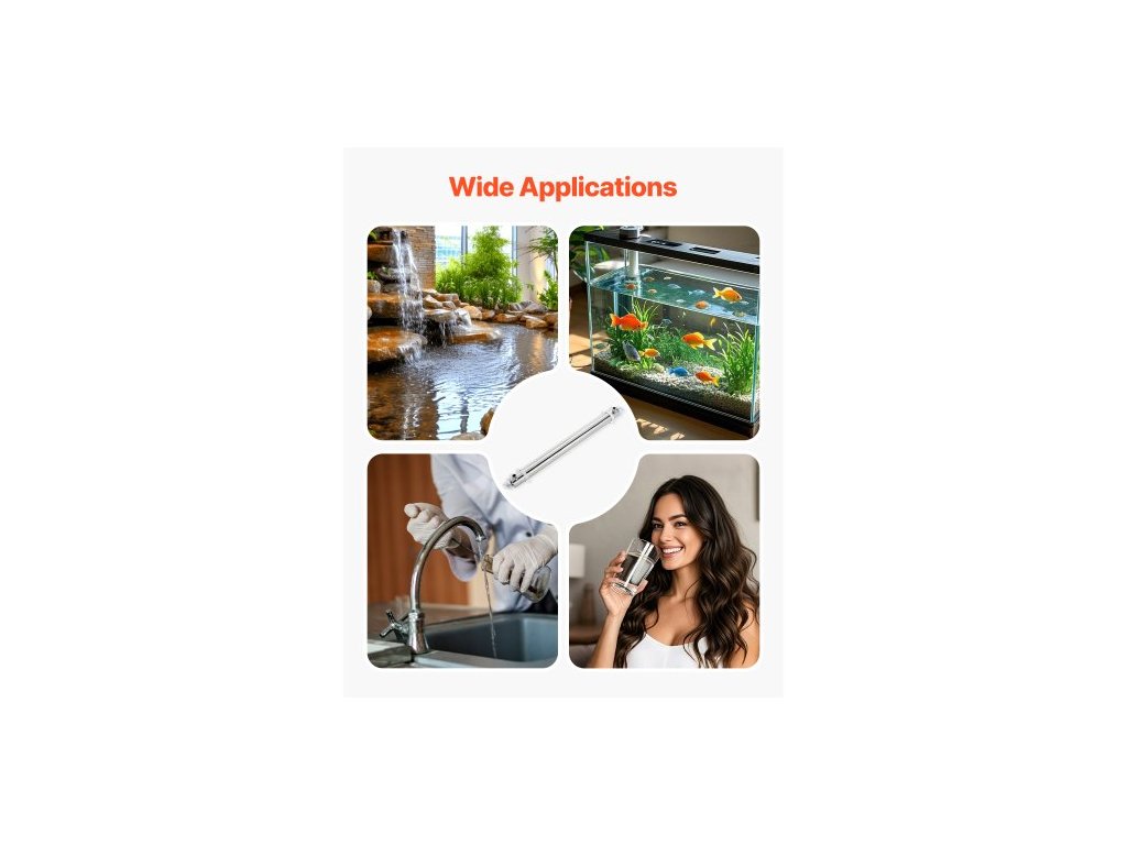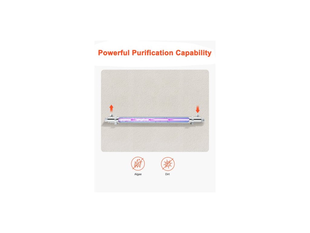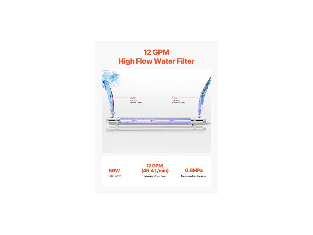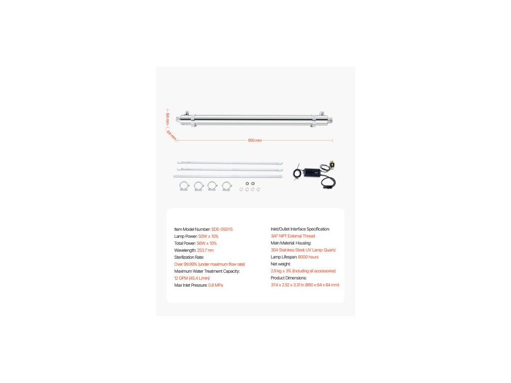 Výkon lampy: 50W ±10%,Maximální kapacita úpravy vody: 12 GPM (45,4 l/min),Celkový výkon: 56W ±10%,Číslo modelu položky: SDE-055YS,Čistá hmotnost: 6,39 lbs/2,9 kg (včetně veškerého příslušenství),Maximální vstupní tlak: 0,8MPa,Rozměry produktu: 37,4 x 2,52 x 3,31 palce/950 x 64 x 84 mm,Vlnová délka: 253,7 nm, Sterilizační rychlost: Více než 99,99 % (pod maximálním průtokem), Hlavní materiál: Pouzdro: Nerezová ocel 304; UV lampa: Křemen, Životnost lampy: 8000 hodin, Specifikace vstupního/výstupního rozhraní: Vnější závit R3/4"