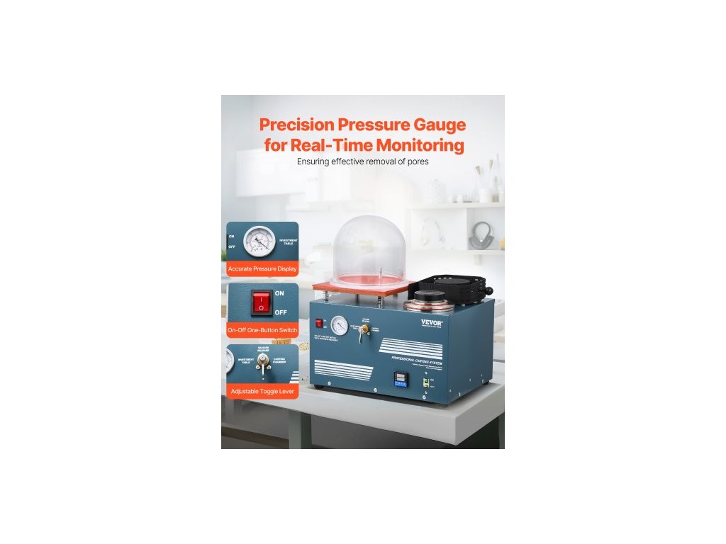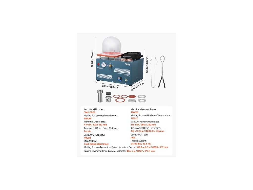 Maximální teplota tavicí pece na zlato: 1150 °C,Maximální výkon tavicí pece na zlato: 1600 W,Rozměry plošiny vakuového krytu: 280 x 280 mm,Maximální velikost objektu: 102 x 152 mm,Typ vakuového oleje: 46#,Číslo modelu položky: DMJ-0002,Hmotnost výrobku: 38,5 kg,Maximální hmotnost stroje Výkon: 1900 W, Rozměry výrobku (D x Š x V): 520 x 410 x 400 mm, Objem sacího oleje: 400 ml, Hlavní materiál: Ocelový plech válcovaný za studena