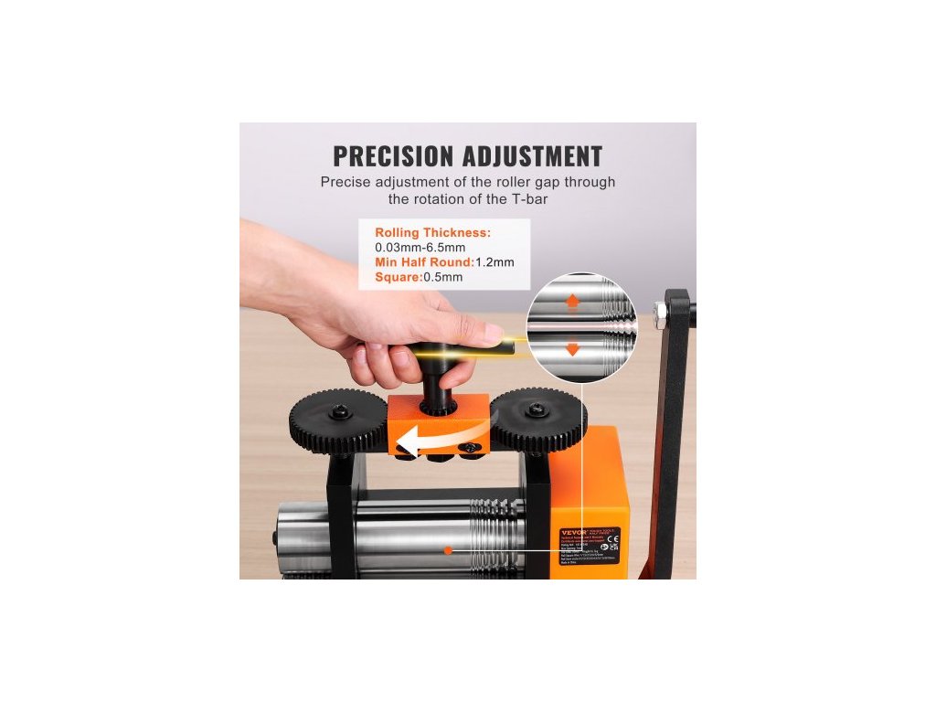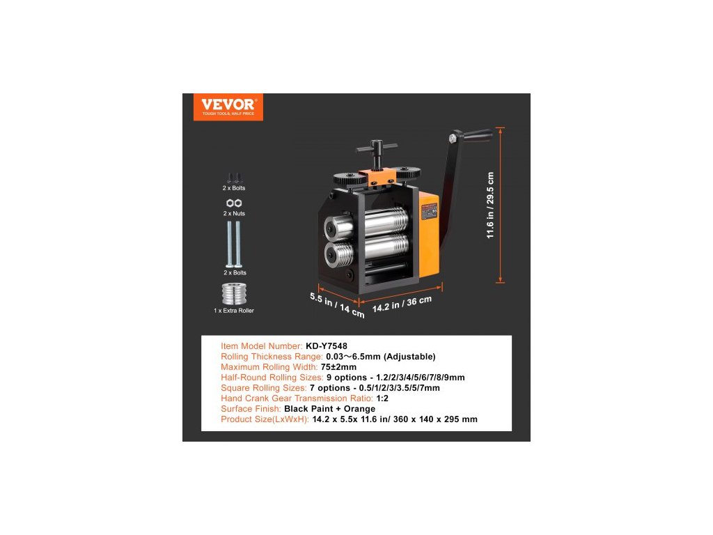 Maximální šířka válcování: 75±2 mm, Převodový poměr ruční kliky: 1:2, Rozsah tloušťky válcování: 0,03~6,5 mm (nastavitelné), Číslo modelu položky: KD-Y7548, Hmotnost výrobku: 36,8 lbs / 16,7 kg±3 %, Velikosti čtvercového válcování: 7 možností - 0,5/1/2/3/3,5/5/7 mm, Převodový poměr horního převodu: 17:50, Povrchová úprava: Černá + oranžová barva, Rozměry výrobku (DxŠxV): 14,2 x 5,5 x 11,6 palce / 360 x 140 x 295 mm, Použití: Lisování zlata/platiny/karátového zlata/mosazi/hliníku, Velikosti půlkulatého válcování: 9 možností - 1,2/2/3/4/5/6/7/8/9 mm, Hlavní materiál: Ocel