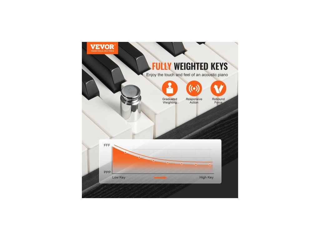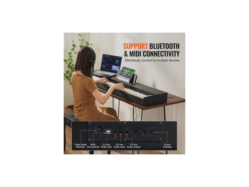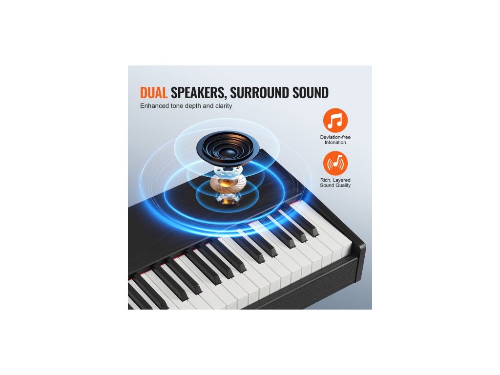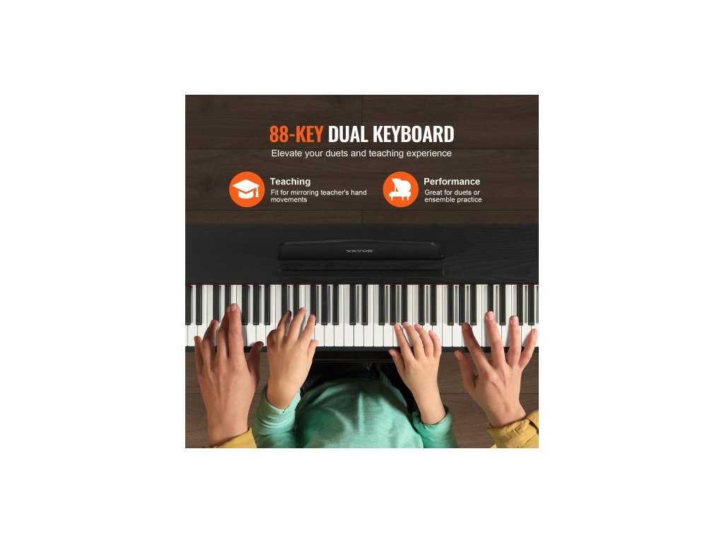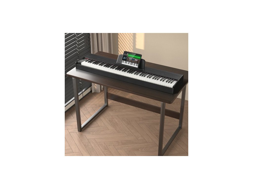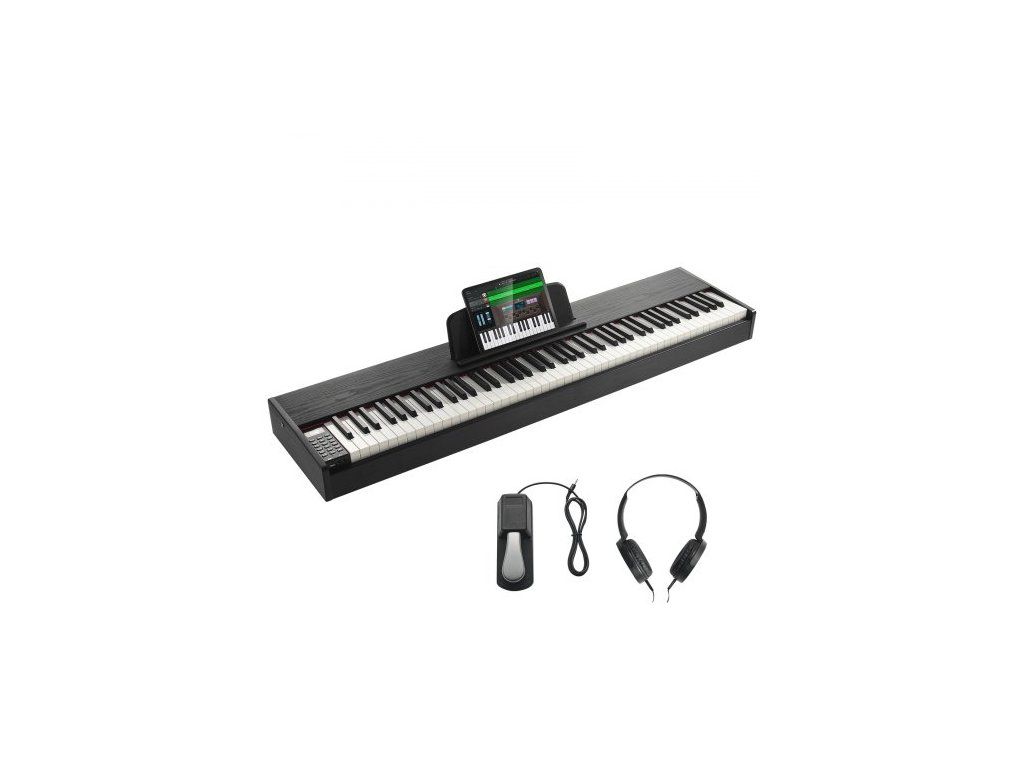 vážené digitální piano, 88 kláves s plně váženými klávesami, elektrické piano, duální klávesnice a reproduktory se sustain pedálem, sluchátka, 200 tónů a rytmů, podpora Bluetooth/USB/MIDI, pro začínající učitele.