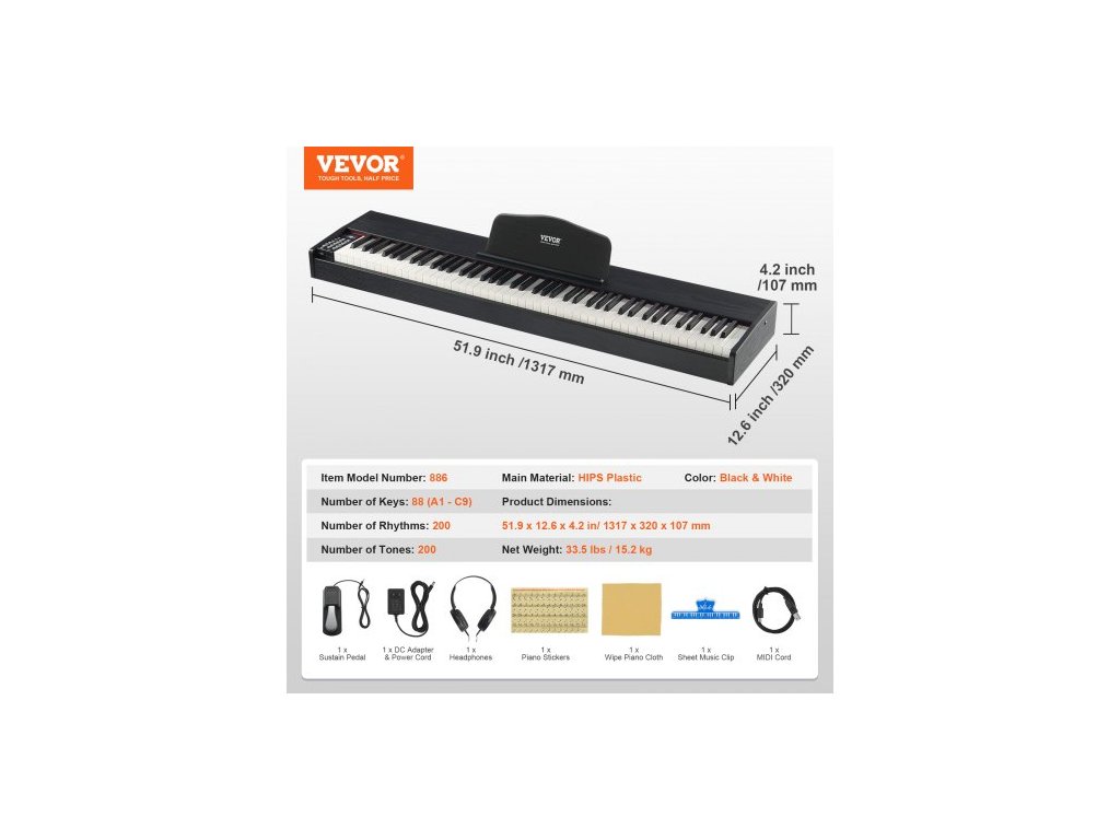 vážené digitální piano, 88 kláves, plně vážené klávesy, elektrické piano, duální klaviatura a reproduktory se sustain pedálem, sluchátka, 200 tónů a rytmů, podpora Bluetooth/USB/MIDI, pro začátečníky a učitele88 kláves, 200 tónů, sustain pedál, efektivní přenos, kompletní příslušenství, stereo prostorový zvuk, počet kláves: 88 (A1 - C9), počet rytmů: 200, počet tónů: 200, barva: černá a bílá, číslo modelu: 886, rozměry produktu: 51,9 x 12,6 x 4,2 palce / 1317 x 320 x 107 mm, hmotnost netto: 33,5 lbs / 15,2 kg, hlavní materiál: plast HIPS