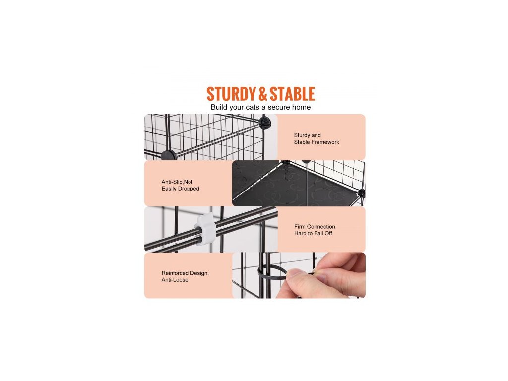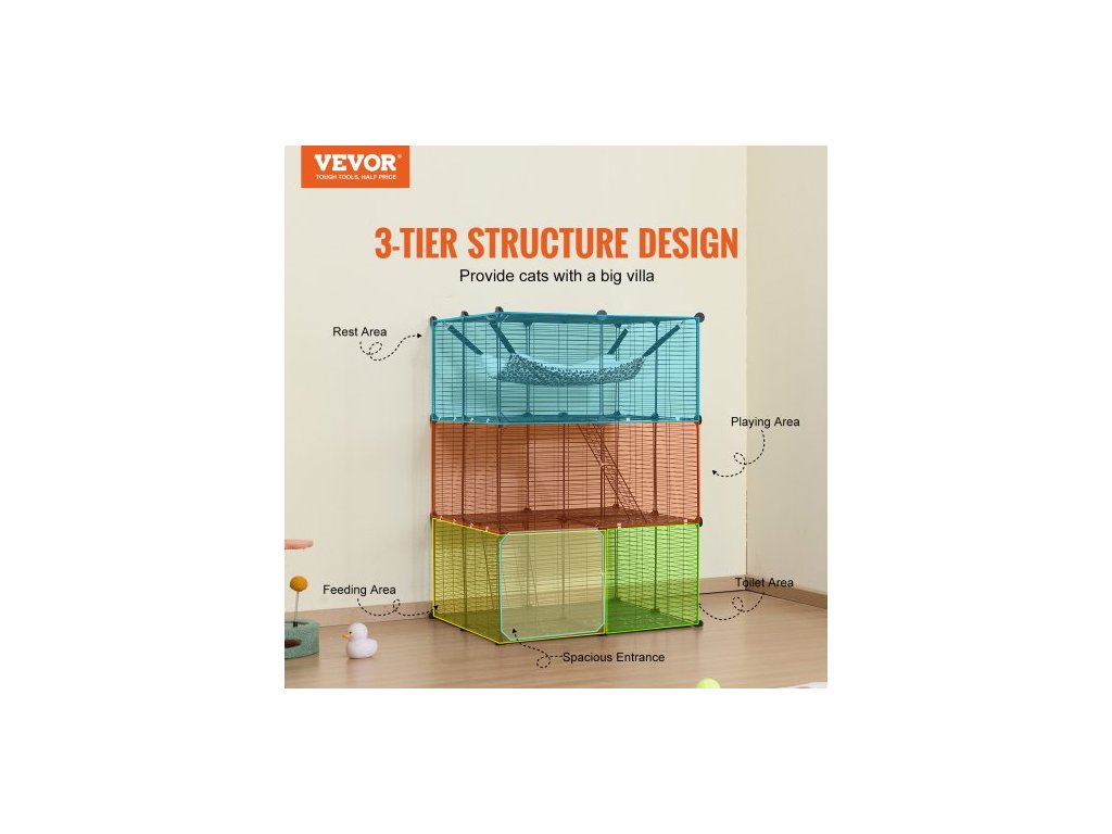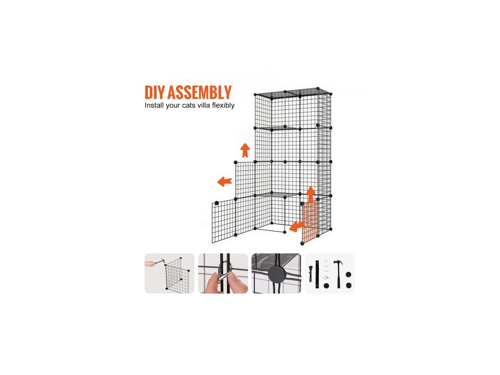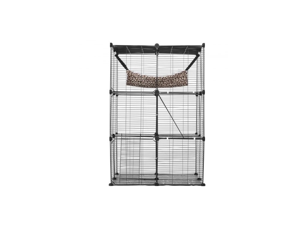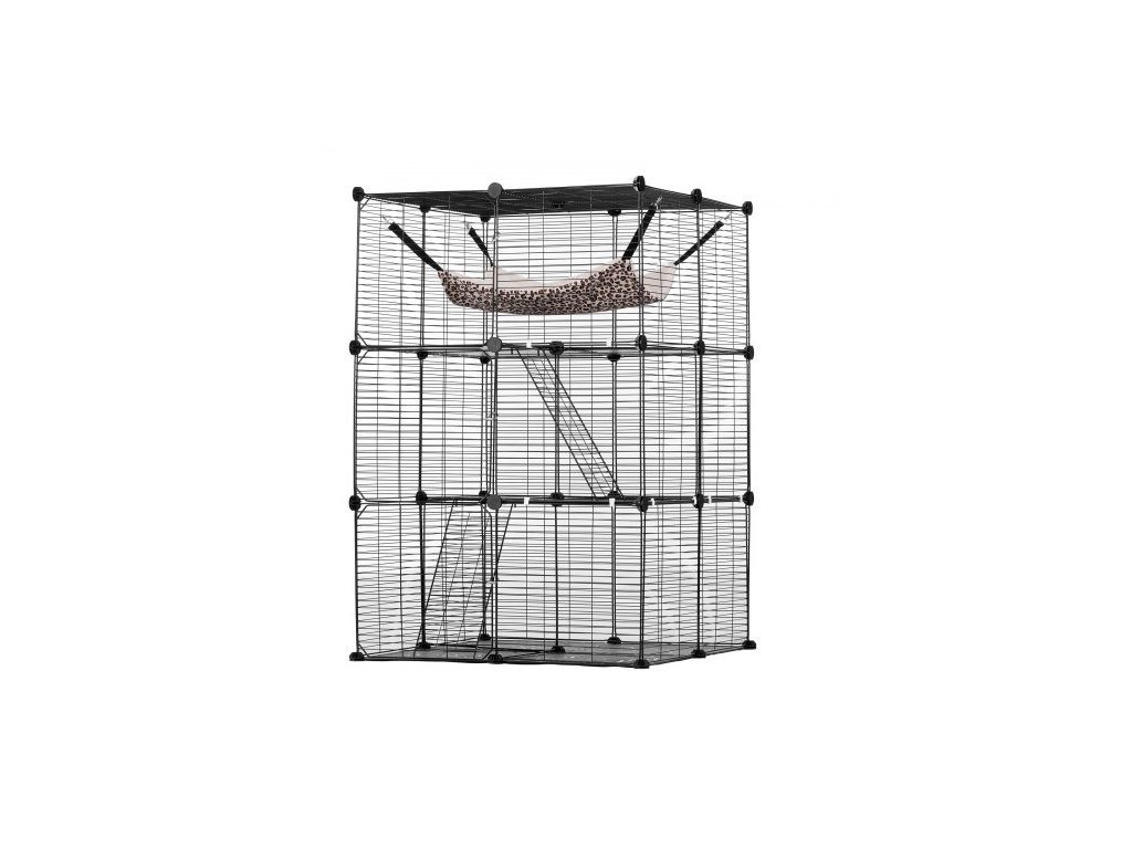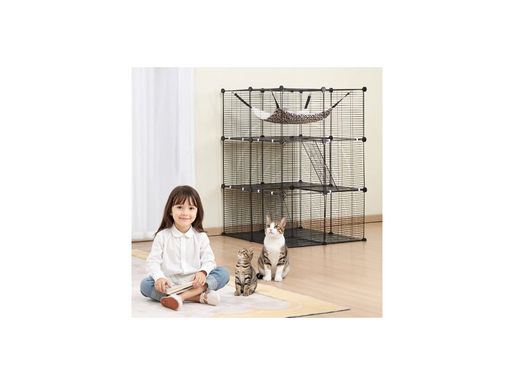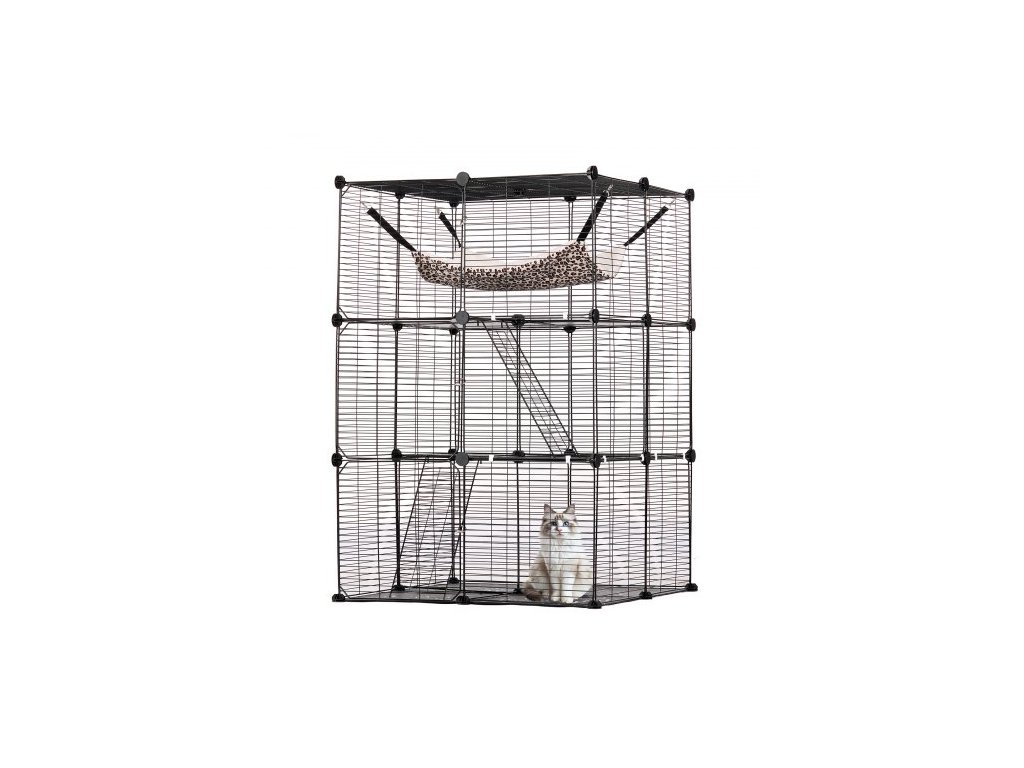 Velká třípatrová kočičí klec , 28 x 28 x 41", odnímatelná kovová drátěná ohrada pro kočky, odolná, s velkou houpací sítí a 2 rampami, vhodná pro kočky v interiéru i exteriéru, snadná montáž, černáProstorná kočičí vila