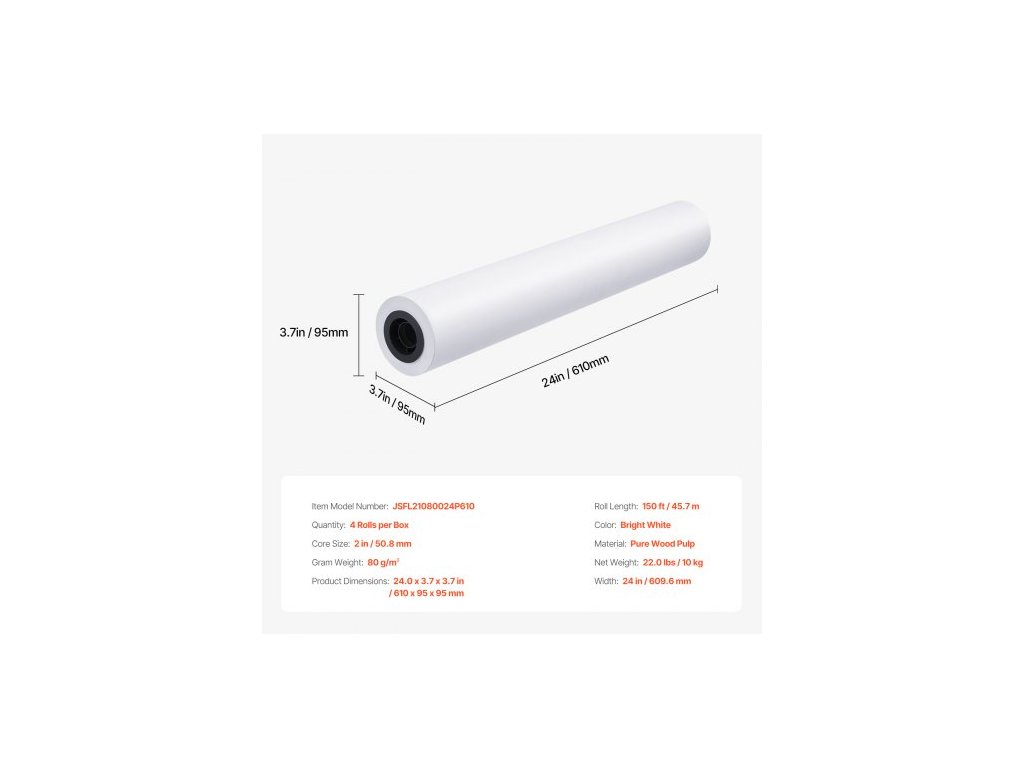 Velikost jádra: 2 palce / 50,8 mm,Barva: Sytě bílá,Číslo modelu položky: JSFL21080024P610,Délka role: 150 stop / 45,7 m,Množství: 4 role v krabici,Materiál: Čistá dřevní buničina,Hmotnost v gramech: 80 g/㎡,Rozměry produktu: 24,0 x 3,7 x 3,7 palce / 610 x 95 x 95 mm, šířka: 609,6 mm, hmotnost netto: 10 kg