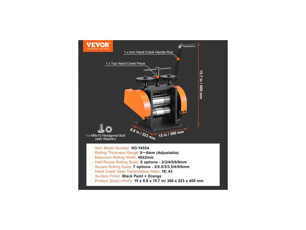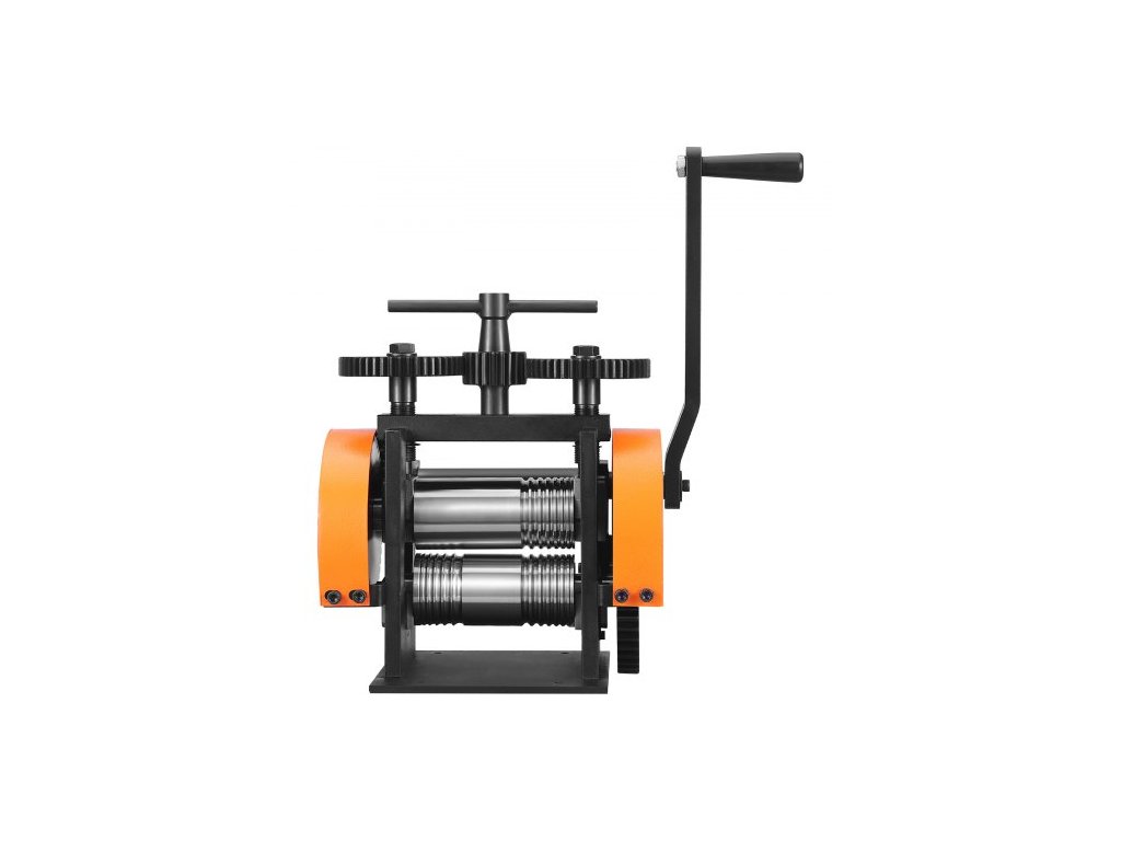 Maximální šířka válcování: 45±2 mm, Převodový poměr ruční kliky: 18:43, Rozsah tloušťky válcování: 0~6 mm (nastavitelný), Číslo modelu položky: KD-Y4554, Hmotnost výrobku: 41 lbs / 18,6 kg±3 %, Velikosti čtvercového válcování: 7 možností - 2/2,5/3/3,5/4/5/6 mm, Převodový poměr s horním nastavením: 23:47,Povrchová úprava: Černá barva + oranžová,Rozměry produktu (DxŠxV): 15 x 8,8 x 15,7 palce / 380 x 223 x 400 mm,Použití: Lisování zlata/platiny/karátského zlata/mosazi/hliníku,Rozměry půlkulatého válcování: 6 možností - 2/3/4/5/6/8 mm,Hlavní materiál: Ocel