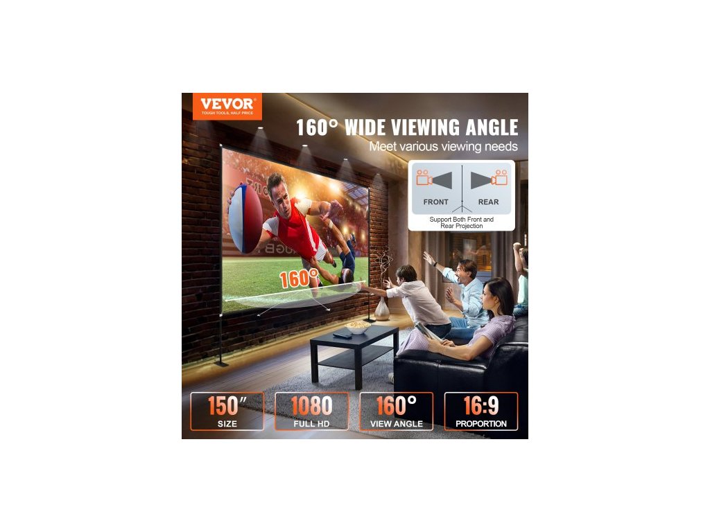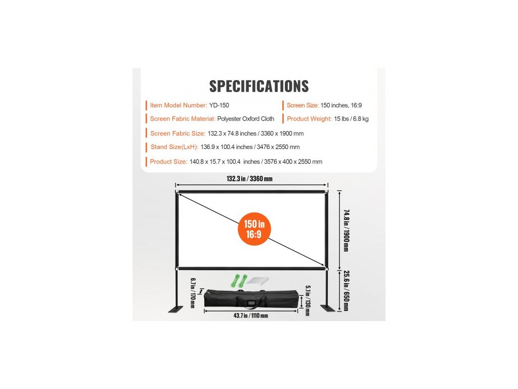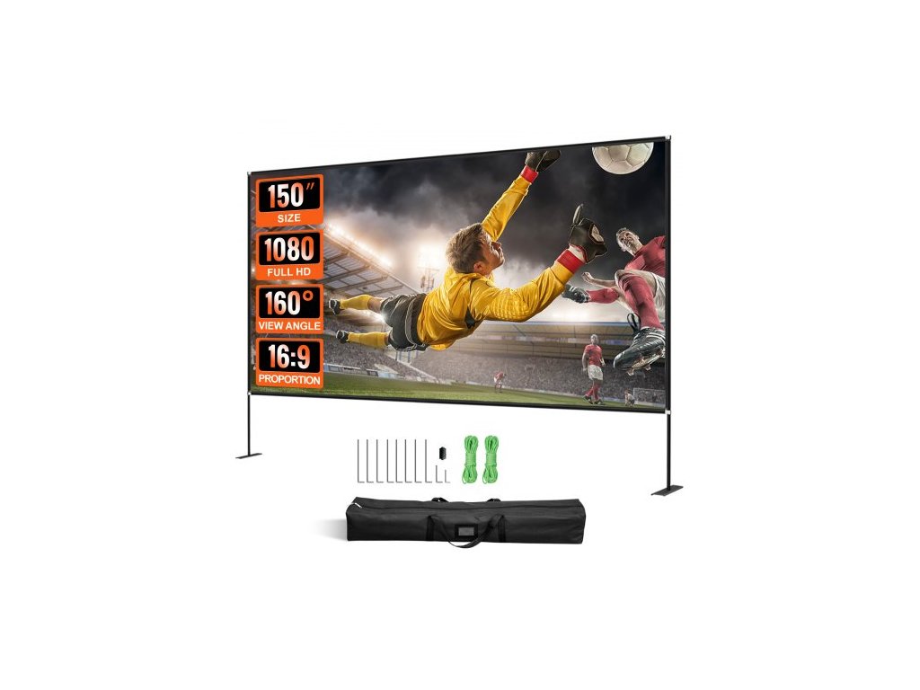 Rozměry plátna: 136,6" x 79,5" / 347 x 201,9 cm,Materiál stojanu: hliník 6061 + ocel 45#,Úhlopříčka: 150" / 381 cm,Pozorovací úhel: 160 stupňů,Výška v rozloženém stavu: 111,3" / 282,7 cm,Materiál plátna: Vysoce textilní Oxfordská tkanina,Délka úložného pouzdra: 43,7" / 111 cm, poměr stran: 16:9