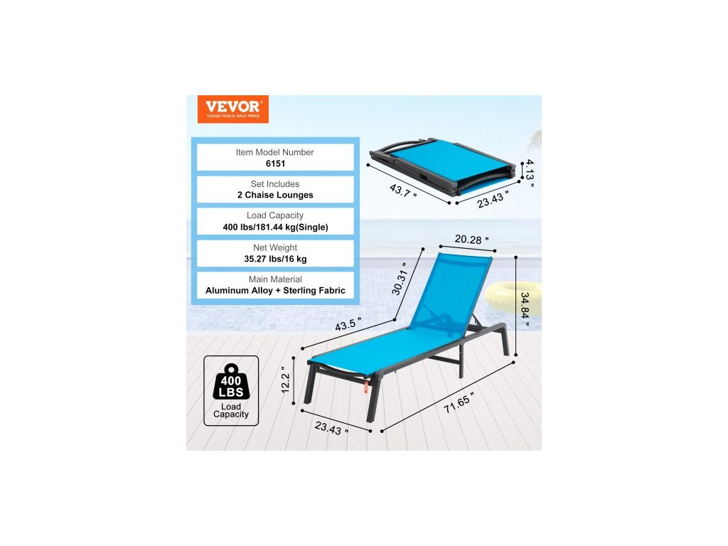 Venkovní lehátka , hliníková zahradní lehátka s nastavitelnými 5 polohami, skládací bazénová lehátka, polohovací a plochá opalovací křesla na terasu, pláž, bazén, modrá, 2 ks