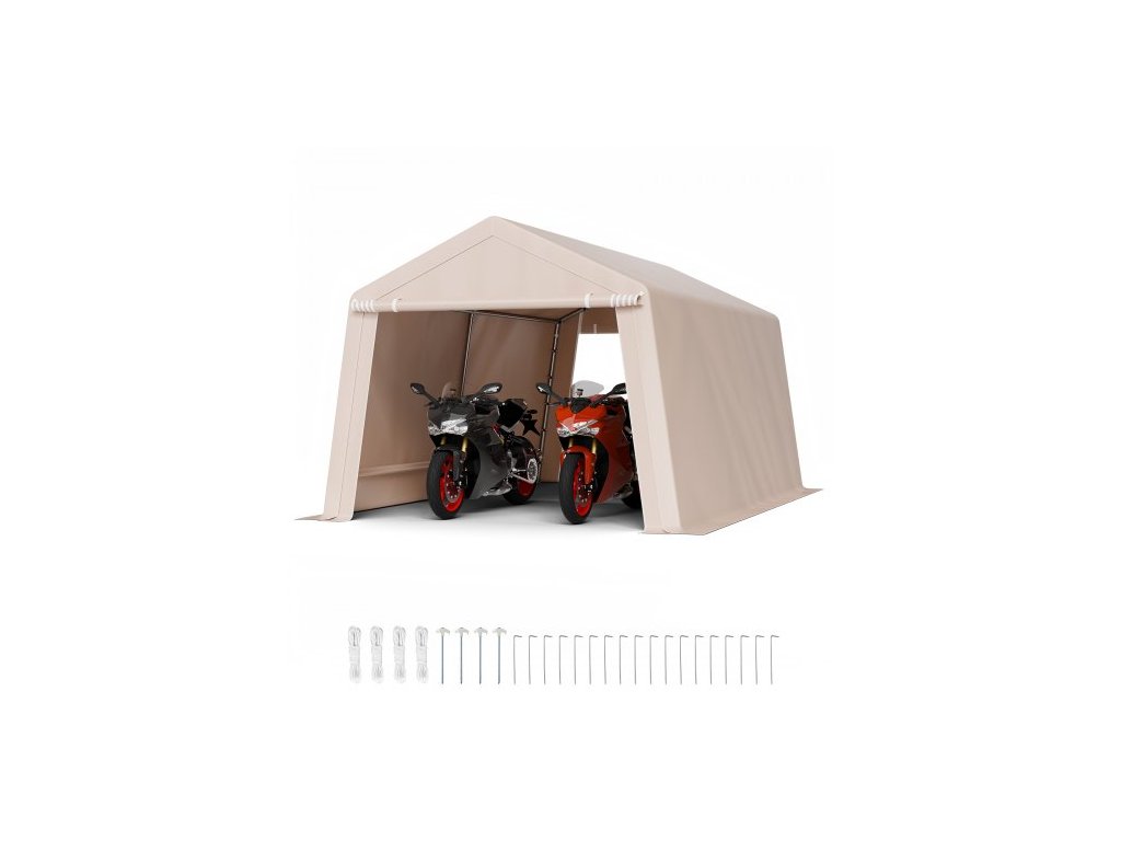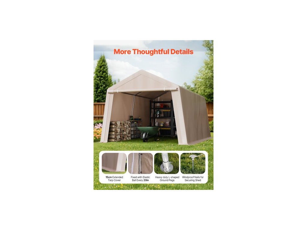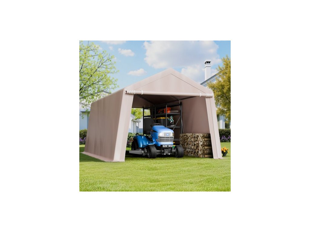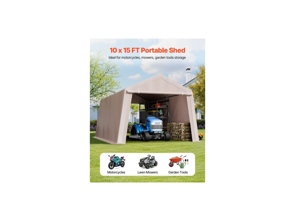 Venkovní skladovací přístřešek , přenosný skladovací stan 10 x 15 stop se 2 rolovacími dveřmi a větracími otvory, vodotěsný přístřešek, odolný rám, přístřešek na terasu a garáž pro motocyklovou sekačku, béžový