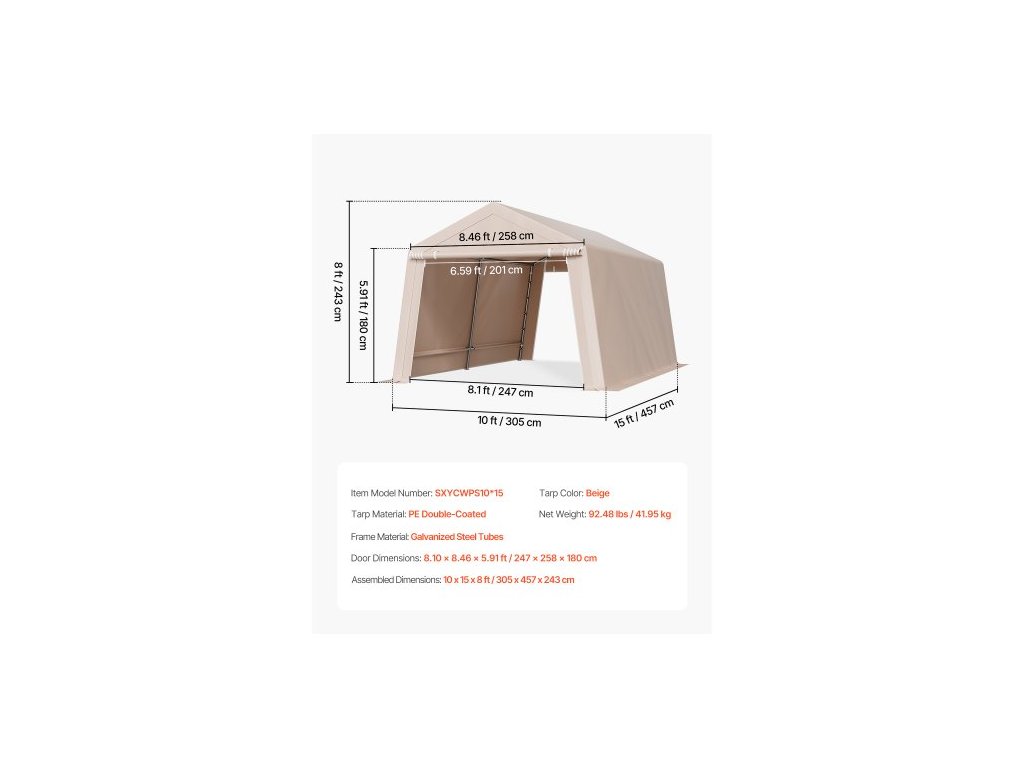Rozměry po sestavení: 10,00 x 15,03 x 8,07 stop / 305 x 458 x 246 cm,číslo modelu položky: SXYCWPS10*15,barva plachty: béžová,materiál rámu: pozinkované ocelové trubky,čistá hmotnost: 92,48 lbs / 41,95 kg,materiál plachty: PE s dvojitým nátěrem