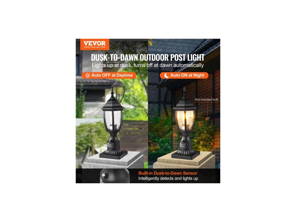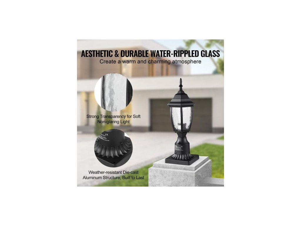 Venkovní sloupové svítidlo Dusk to Dawn, výška 400 mm, vodotěsné svítidlo na sloup s 3,5palcovou základnou pro montáž na sloup, skleněné stínidlo, bleskotěsné venkovní sloupové svítidlo pro terasu a zahradní cestuElegantní a odolné