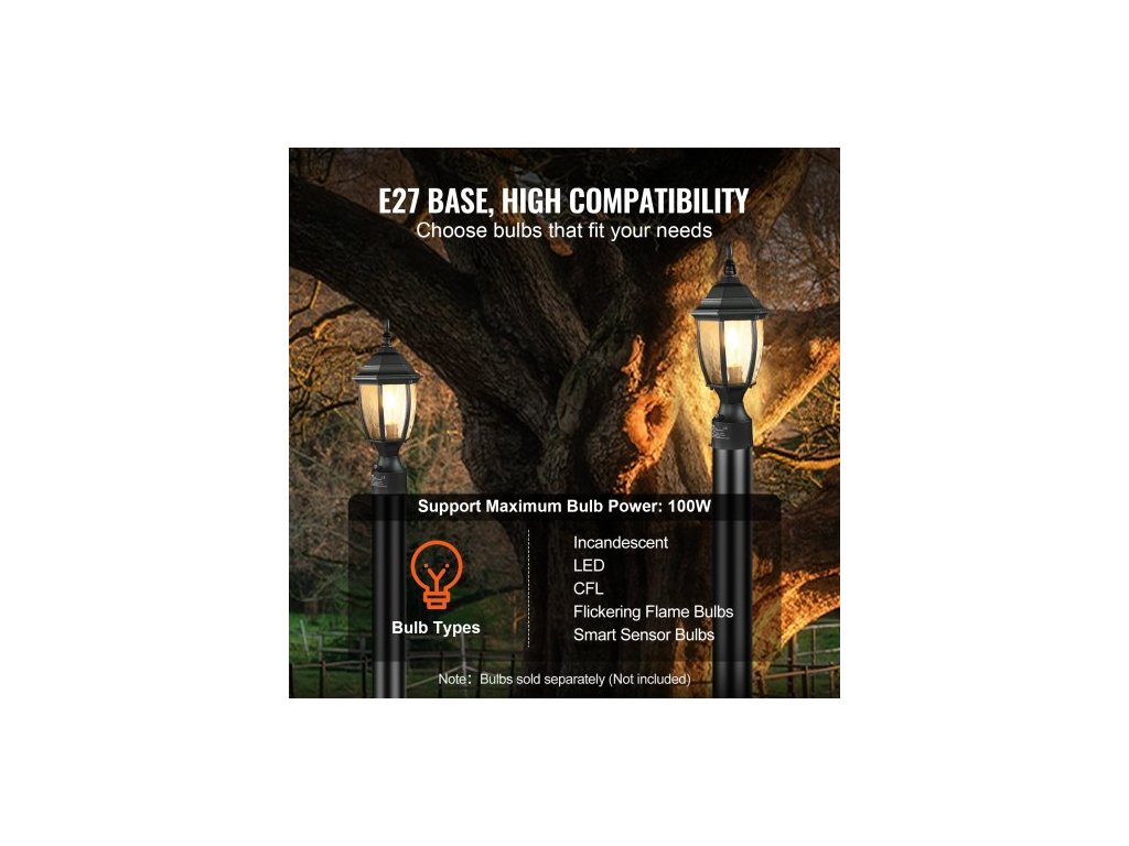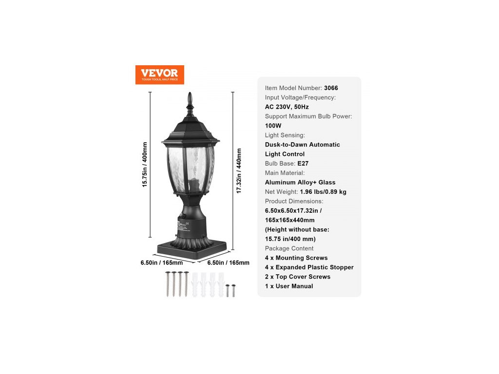 Patic žárovky: E27, Podpora maximálního výkonu žárovky: 100 W, Snímání světla: Automatické ovládání světla od soumraku do úsvitu, Číslo modelu položky: 3066, Rozměry produktu: 6,50x6,50x17,32 palce / 165x165x440 mm (výška bez základny: 15,75 palce/400 mm), Vstupní napětí/frekvence: AC 230V, 50Hz, Čistá hmotnost: 1,96 lbs/0,89 kg, Hlavní materiál: Hliník Slitina + sklo