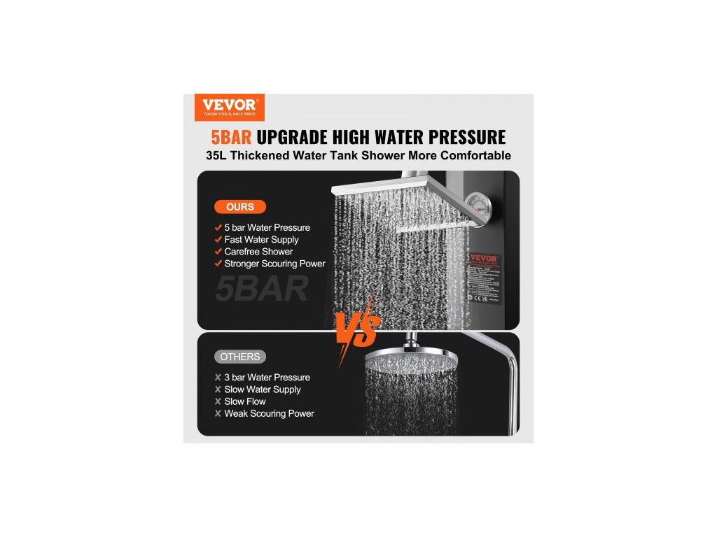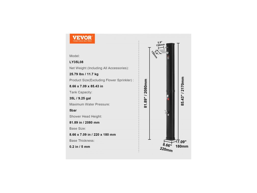 Maximální tlak vody: 5 barů, Čistá hmotnost (včetně veškerého příslušenství): 11,7 kg, Objem nádrže: 35 l / 9,25 gal, Rozměry základny: 220 x 180 mm, Model: LY35L08, Tloušťka základny: 5 mm, Rozměry produktu (bez zavlažovače květin): 220 x 180 mm 85,43 palce / 220 x 180 x 2170 mm, Výška sprchové hlavice: 81,89 palce / 2080 mm
