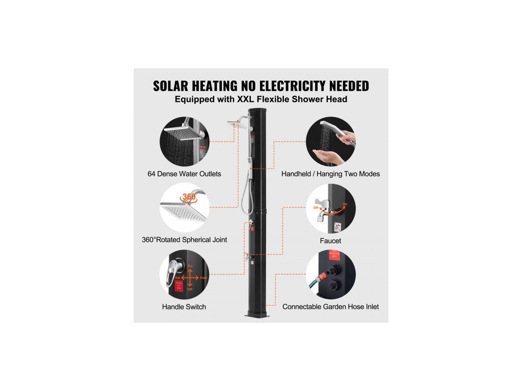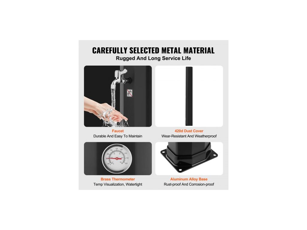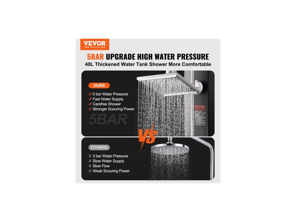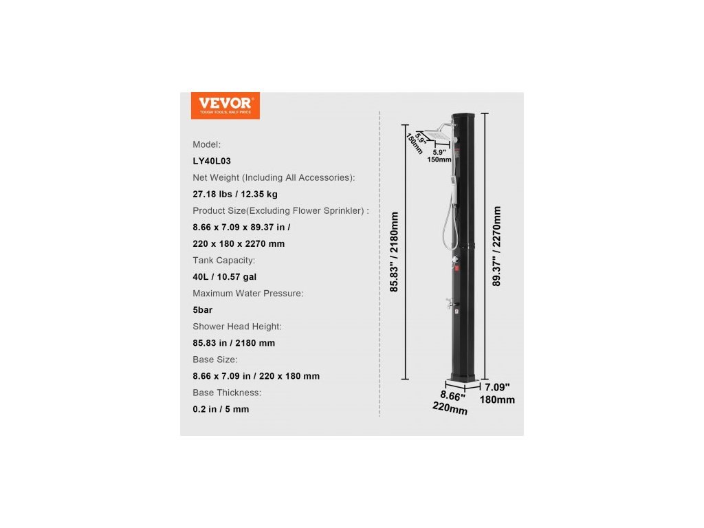 Maximální tlak vody: 5 barů, Čistá hmotnost (včetně veškerého příslušenství): 27,18 lbs / 12,35 kg, Objem nádrže: 40 l / 10,57 gal, Rozměry základny: 8,86 x 7,09 palce / 220 x 180 mm, Model: LY40L03, Tloušťka základny: 0,2 palce / 5 mm, Velikost produktu (bez zavlažovače květin): 8,66 x 7,09 x 89,37 palce / 220 x 180 x 2270 mm, Výška sprchové hlavice: 85,83 palce / 2180 mm