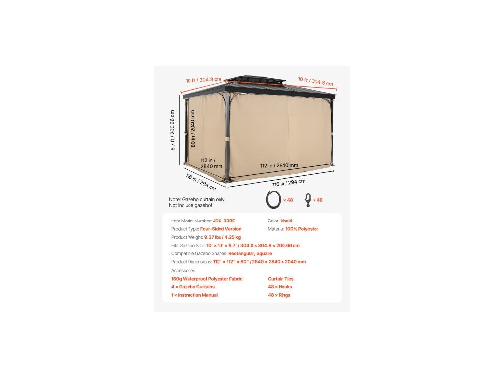 Typ produktu: Čtyřstranná verze,Barva: Khaki,Číslo modelu položky: JDC-33BE,Hmotnost produktu: 10 lbs / 4,55 kg,Materiál: 100% polyester,Kompatibilní tvary altánu: Obdélníkový, Čtvercový,Vhodné pro velikost altánu: 10' x 10' x 6,7' / 284 x 284 x 204 cm,Rozměry produktu: 112" x 112" x 80" / 2840 × 2840 × 2040 mm