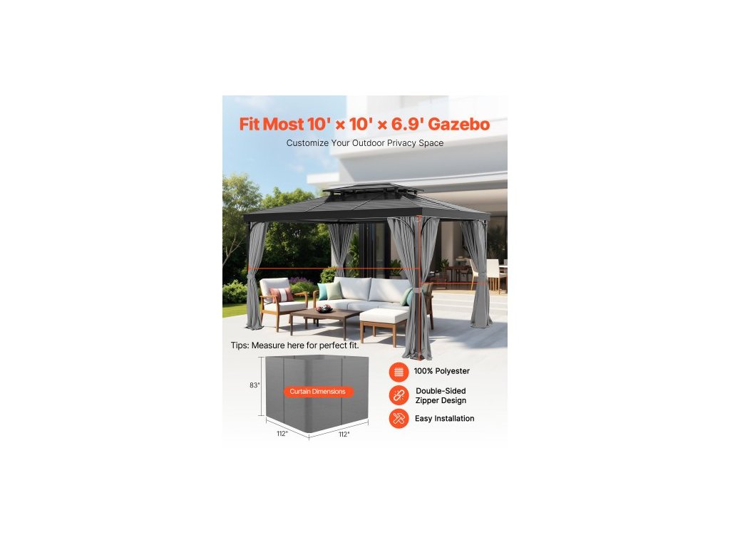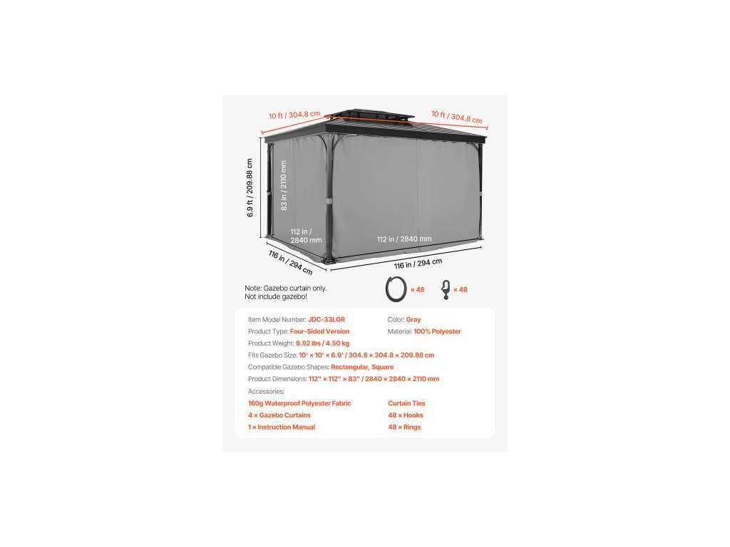 Typ produktu: Čtyřstranná verze,Barva: Šedá,Číslo modelu položky: JDC-33LGR,Hmotnost produktu: 10,5 lbs / 4,75 kg,Materiál: 100% polyester,Kompatibilní tvary altánu: Obdélníkový, Čtvercový,Vhodné pro velikost altánu: 10' x 10' x 6,9' / 284 x 284 x 211 cm,Rozměry produktu: 112" x 112" x 83" / 2840 × 2840 × 2110 mm