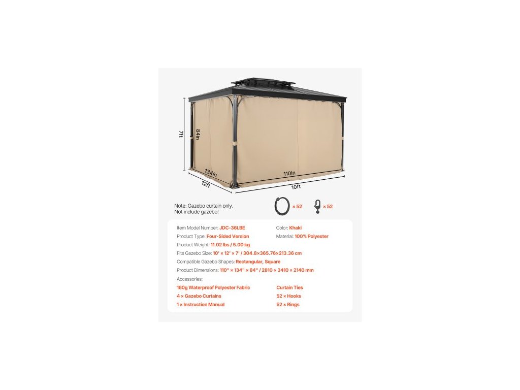 Typ produktu: Čtyřstranná verze,Barva: Khaki,Číslo modelu položky: JDC-36LBE,Hmotnost produktu: 11 lbs / 5,10 kg,Materiál: 100% polyester,Kompatibilní tvary altánu: Obdélníkový, Čtvercový,Vhodné pro velikost altánu: 10' x 12' x 7' / 281 x 341 x 214 cm,Rozměry produktu: 110" x 134" x 84" / 2810 x 3410 x 2140 mm