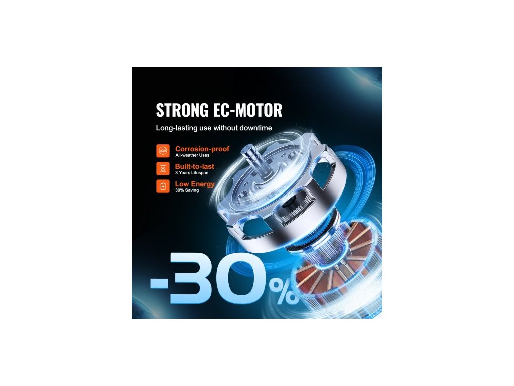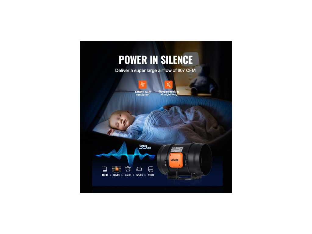 Průtok vzduchu: 807 CFM,Hladina hluku: ≤ 50 dB (přibližně 39 dB),Rozměry (D x Š x V): 12 x 9,4 x 10,8 palce / 304 x 240 x 275 mm,Typ motoru: Měděný motor,Model: VV-GDFJ-EC8,Tlak vzduchu: 350 Pa,Jmenovitý výkon: 68 W,Otáčky ventilátoru: 3000 ot./min,Hmotnost: 6,4 lbs / 2,9 kg, Napětí / Frekvence: AC 110V-240V, 50/60Hz