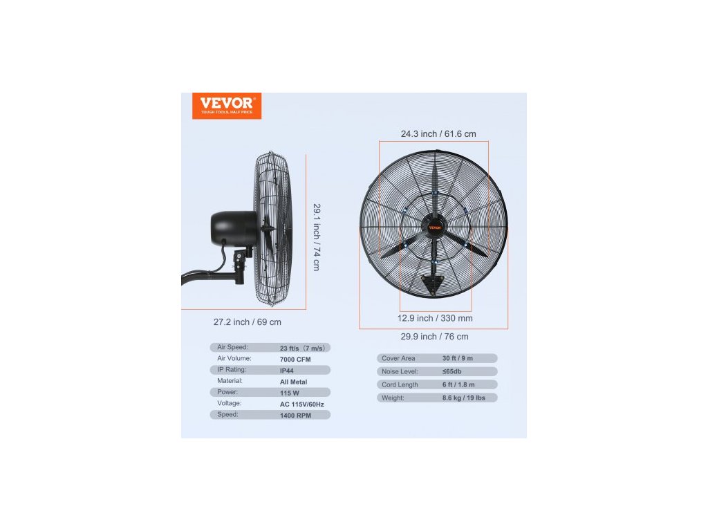 Dosah: 9 m, Výkon: 115 W, Rychlost vzduchu: 7 m/s, Objem vzduchu: 7 000 CFM, Hmotnost: 8,6 kg, Rychlost: 1400 ot/min, Délka kabelu: 1,8 m, Číslo modelu položky: VV-BGSFS24, Hladina hluku: ≤ 65 dB, Materiál: celokovový, Průměr lopatek ventilátoru: 61,6 cm