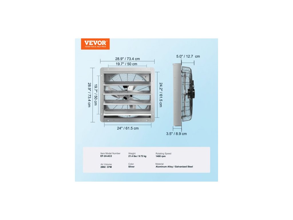 Rychlost otáčení: 1400 ot./min, objem vzduchu: 2892 CFM, napětí: AC 220V/50Hz, barva: stříbrná, model: EF-24-AC2, materiál: hliníková slitina, pozinkovaná ocel, rozměry výrobku: 28,54 x 28,54 x 9,06 palce / 725 x 725 x 230 mm, hmotnost: 21,43 lbs / 9,72 kg, příkon: 115 W