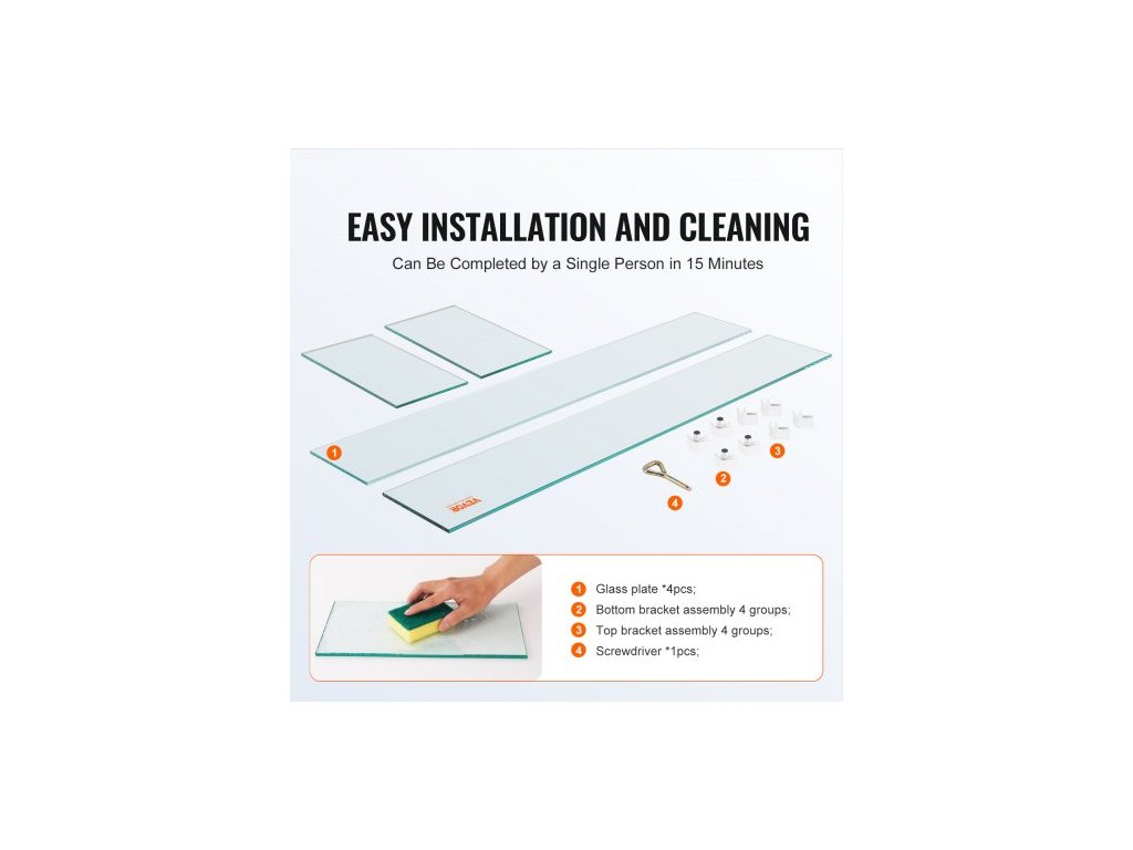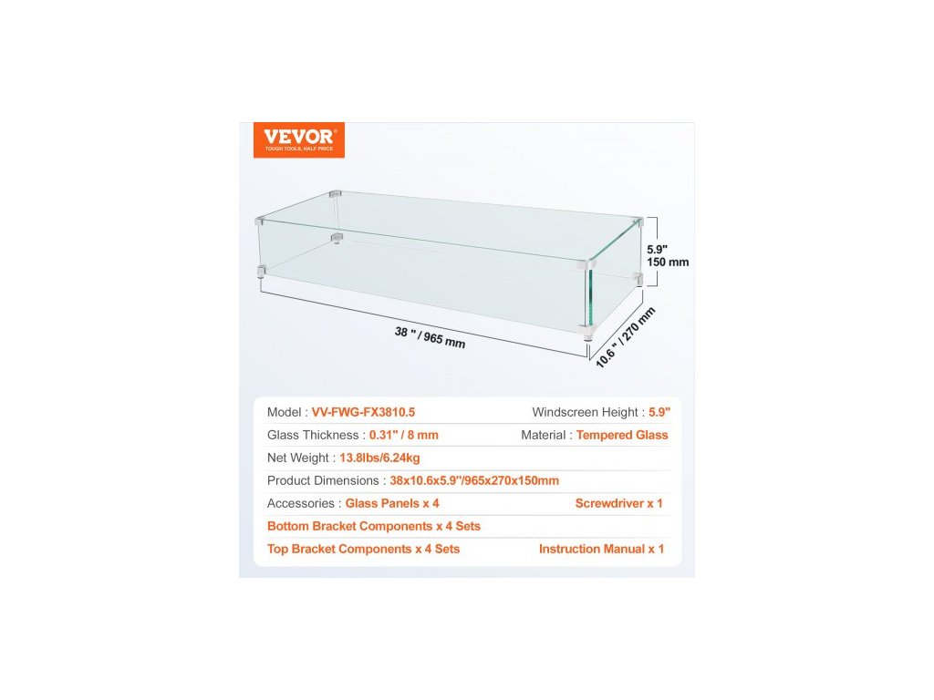 Materiál konzol: Hliníková slitina,Rozměry výrobku: 38 x 10,5 x 6 palců / 965 x 267 x 152 mm,Materiál desek: Tvrzené sklo,Barva: Čirá,Model: VV-FWG-FX3810.5,Tloušťka skla: 0,3 palce,Hmotnost výrobku: 16,5 lbs / 7,5 kg
