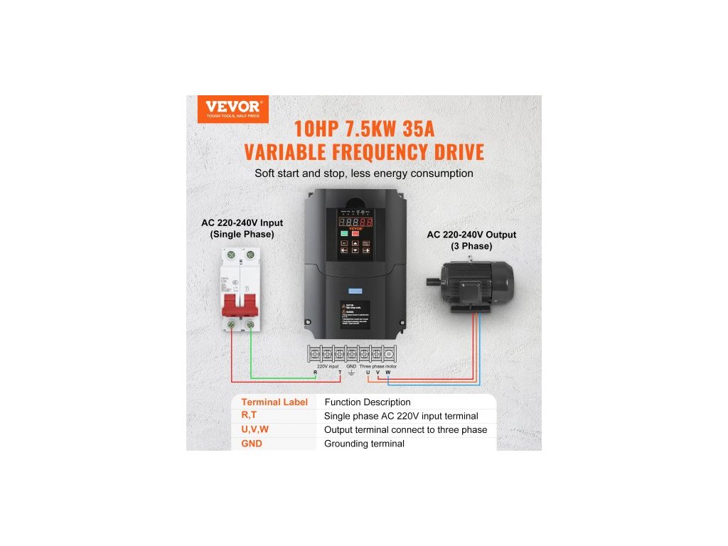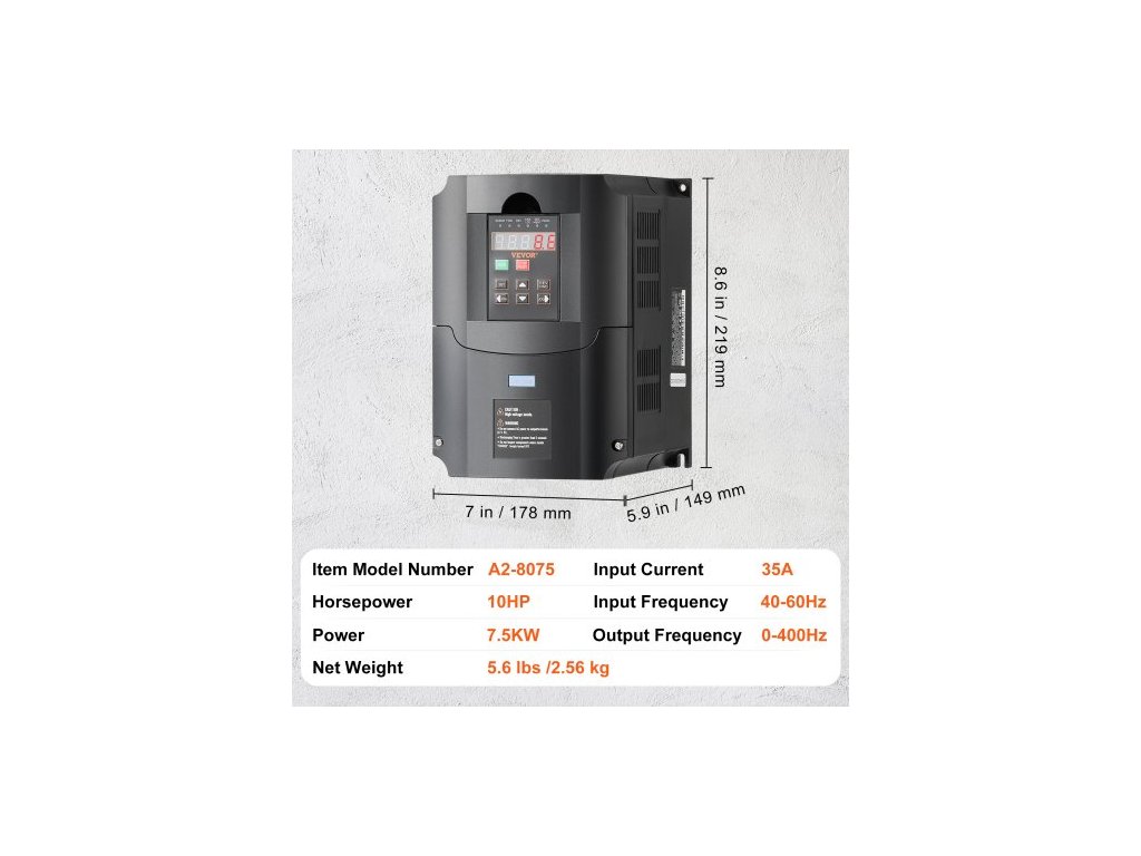 Vstupní frekvence: 40-60Hz,Výkon: 10HP,Číslo modelu položky: A2-8075,Vstupní napětí: 220V (jednofázové nebo třífázové),Rozměry produktu: 8,6 x 5,9 x 7,0 palců / 219 x 149 x 178 mm,Výstupní napětí: 220V (třífázové),Čistá hmotnost: 5,6 lbs / 2,56 kg, Vstupní proud: 35 A, Výkon: 7,5 kW, Hlavní materiál: Ohnivzdorný ABS, Výstupní frekvence: 0–400 Hz