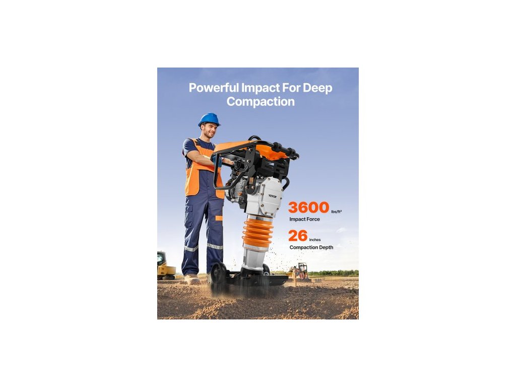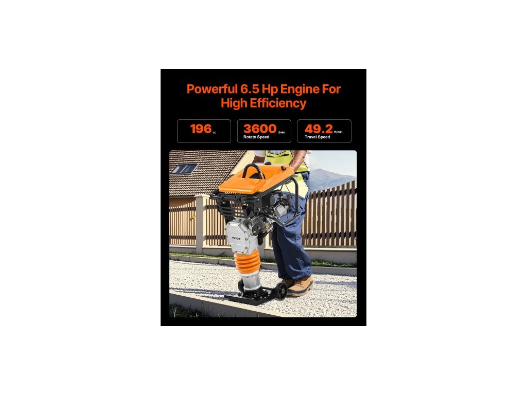 Vibrační pěch Jumping Jack, vibrační pěch 6,5 HP, palivový motor o objemu 196 ccm, rázová síla 3600 lbs, maximální hloubka zhutnění 26" (61 cm), pro zeminu, štěrk, základy, betonové desky a základyVýkonný výkon