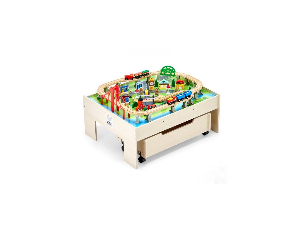 Vláčkový stůl, 100 vícebarevných dílků, dřevěný dětský aktivní stůl s úložným prostorem na kolečkách, sada 3 v 1 dřevěných vláčků pro hraní, kreslení, čtení, jídlo, kreativní sada hraček pro děti od 3 letSada s městskou tematikou