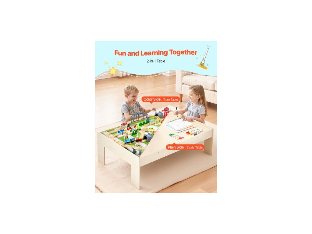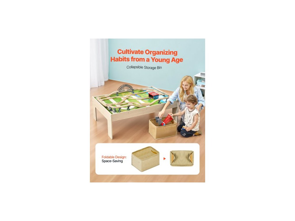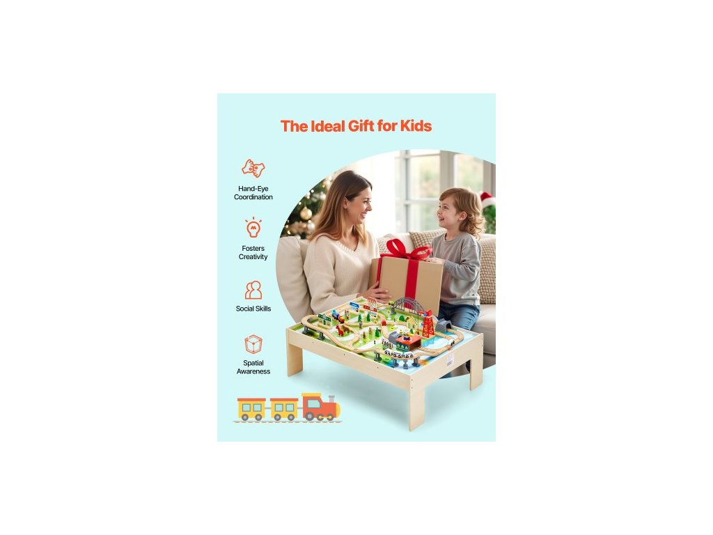 Vláčkový stůl, 120 vícebarevných dílků, dřevěný dětský aktivní stůl se skládacím úložným prostorem, sada 3 dřevěných vláčků pro hraní, kreslení, čtení, jídlo, kreativní sada hraček pro děti od 3 let