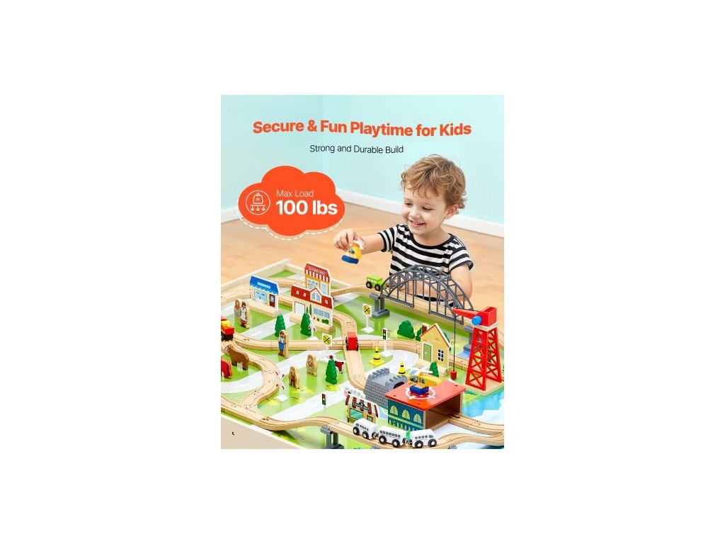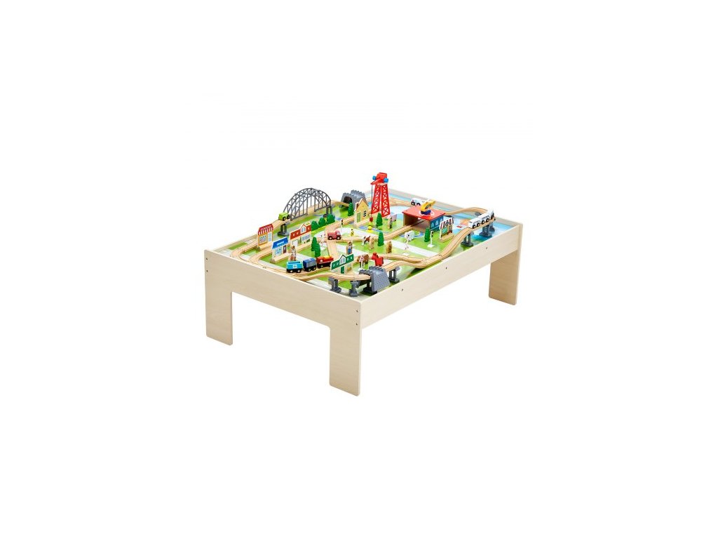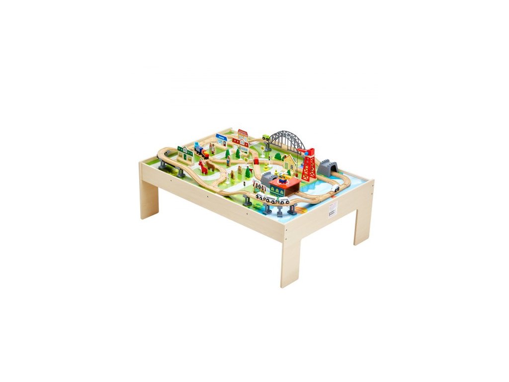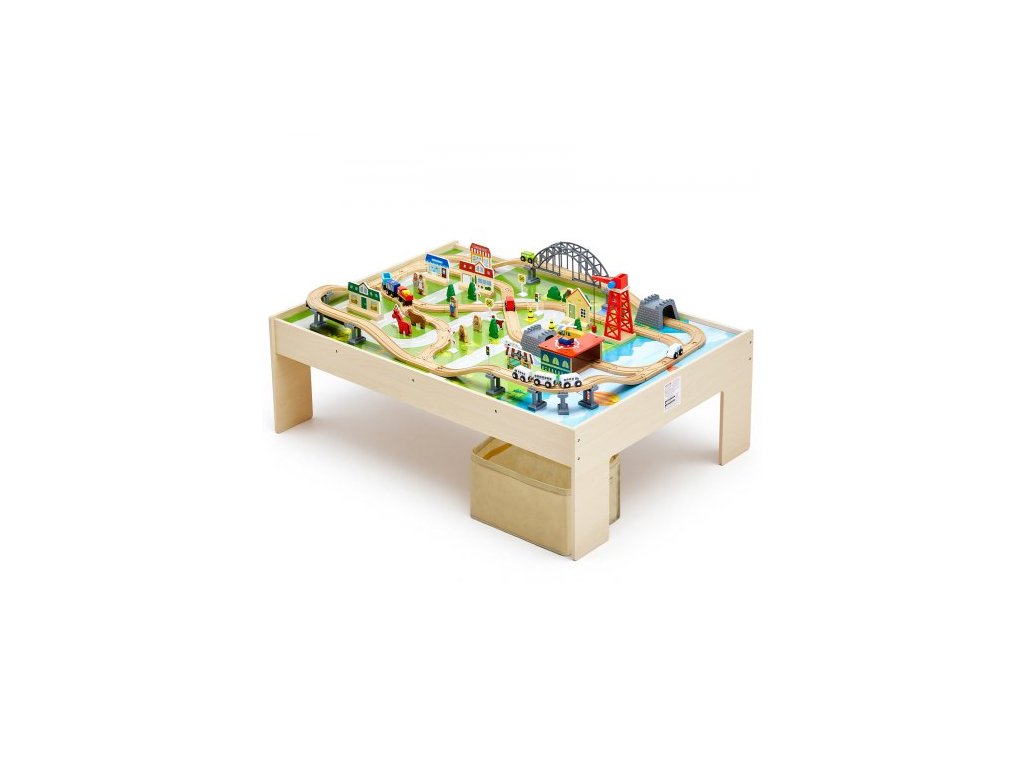 Vláčkový stůl, 120 vícebarevných dílků, dřevěný dětský aktivní stůl se skládacím úložným prostorem, sada 3 v 1 dřevěný vláček pro hraní her, kreslení, čtení, jídlo, kreativní sada hraček pro děti od 3 letDráhové dobrodružství
