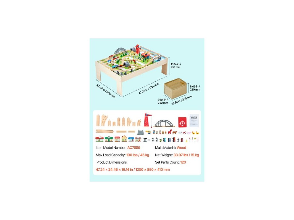 Počet dílů sady: 120,Číslo modelu položky: AC7559,Maximální nosnost: 45 kg,Rozměry výrobku: 1200 x 850 x 410 mm,Čistá hmotnost: 15 kg,Hlavní materiál: Dřevo