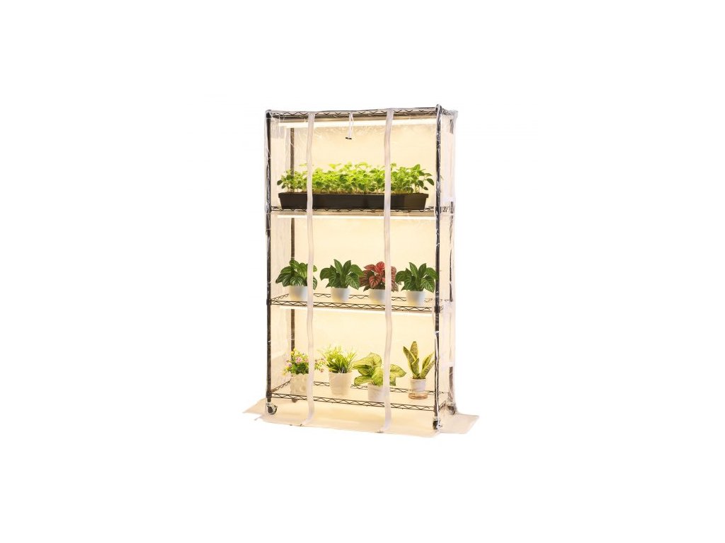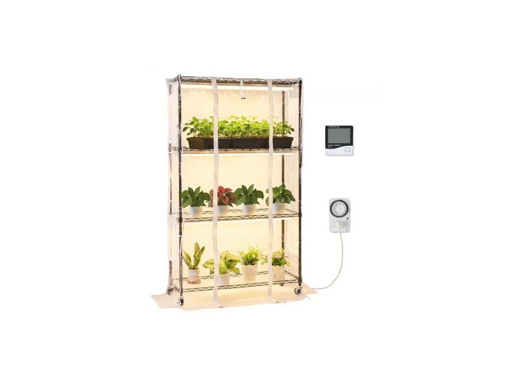 Vnitřní skleník s pěstebním světlem, 150 cm vysoký 4patrový stojan na rostliny s průhledným krytem, časovačem a vlhkoměrem, 180W plnospektrální pěstební světla, kovový držák police s osvětlením pro pokojové rostliny