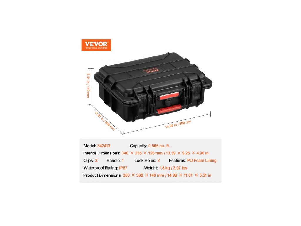 Vnitřní rozměry: 340 × 235 × 126 mm/13,39 × 9,25 × 4,96 palce,Otvory pro zámky: 2,Klipy: 2,Vodotěsnost: IP67,Objem: 0,565 cu. ft.,Model: 342413,Vlastnosti: Podšívka z PU pěny,Rozměry produktu: 380 × 300 × 140 mm/14,96 × 11,81 × 5,51 palce,Hmotnost: 1,8 kg/3,97 lbs,Rukojeť: 1