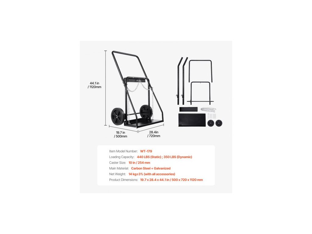Číslo modelu položky: WT-179,Rozměry koleček: 10 palců / 254 mm,Nosnost: 440 liber (statická); 350 liber (dynamická),Rozměry výrobku: 19,7 x 28,4 x 44,1 palce / 500 x 720 x 1120 mm,Čistá hmotnost: 30,86 liber / 14 kg,Hlavní materiál: Uhlíková ocel + pozink