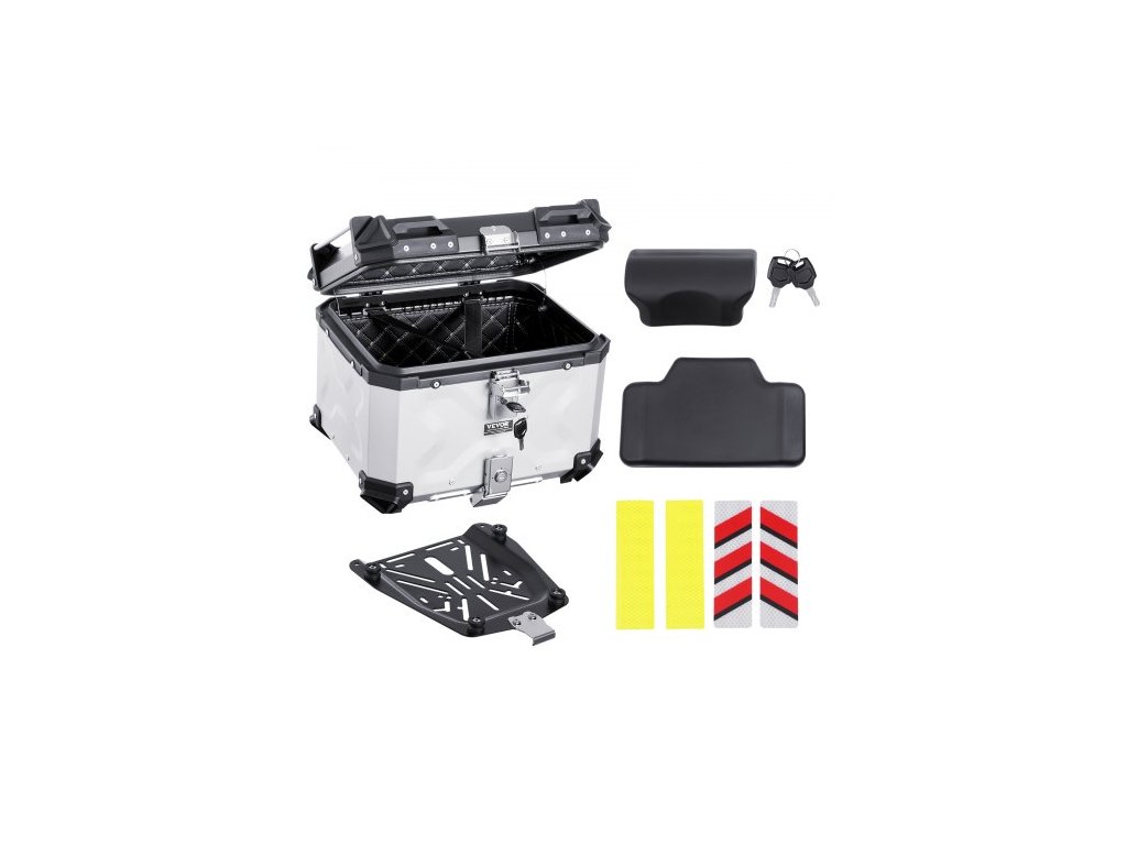 Vrchní kufr na motocykl , univerzální hliníkový zadní box na motocykl s koženou podšívkou, vodotěsný odnímatelný horní box o objemu 45 l se zámkem a zadním polštářem, vhodný pro 99 % rámů motocyklůOdolný a spolehlivý