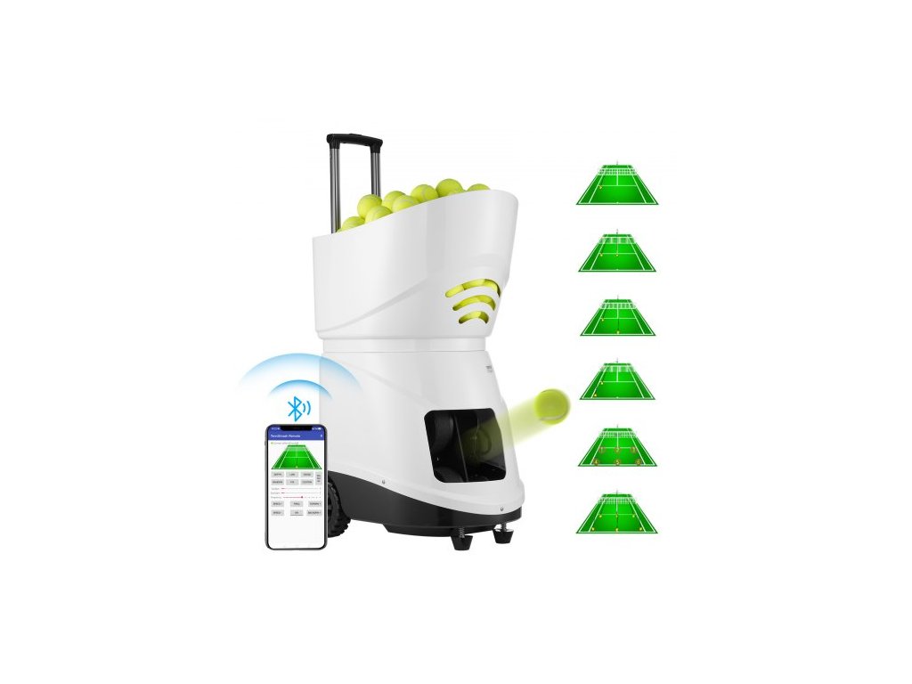 Kapacita míčků: 150 míčků, maximální rychlost míčku: 125 km/h, efektivní dosah připojení Bluetooth: ≥30 m, číslo modelu položky: TS-08, hmotnost výrobku: 21,8 kg, rozměry výrobku: 510 x 385 x 505 mm (bez zatahovací tyče)