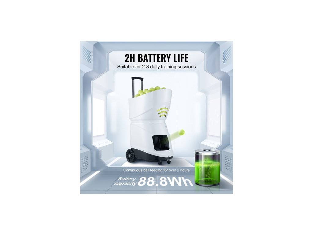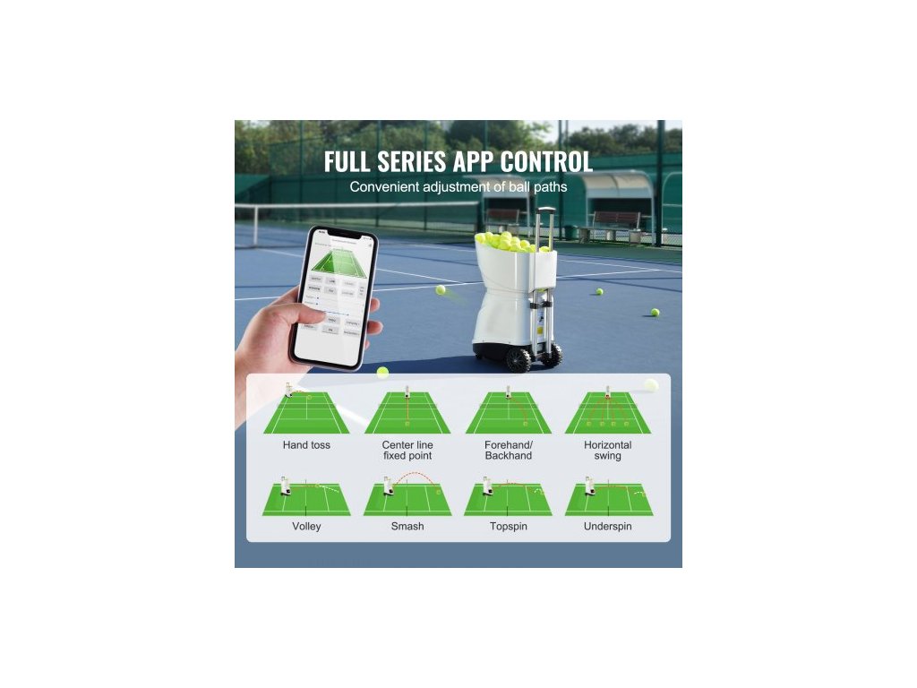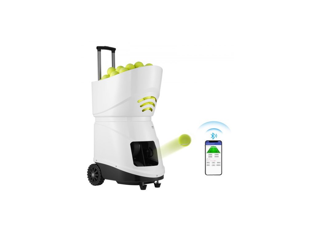 Kapacita míčků: 150 míčků, maximální rychlost míčku: 125 km/h, efektivní dosah připojení Bluetooth: ≥30 m, číslo modelu položky: TS-06, hmotnost výrobku: 21,8 kg, rozměry výrobku: 510 x 385 x 505 mm (bez zatahovací tyče)