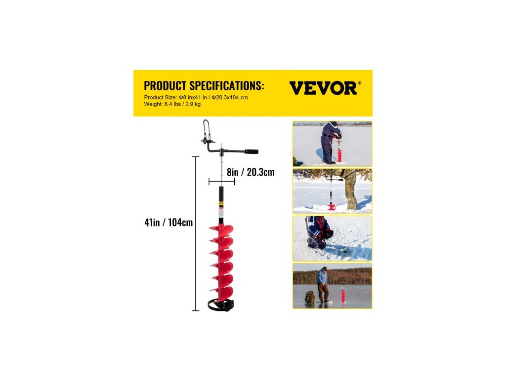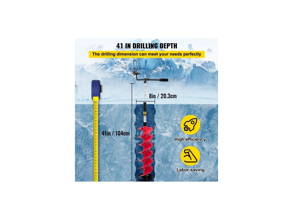 vrták do ledu, nylonový vrták do ledu o průměru 8", délka vrtáku do ledu 41", vrták s nastavitelnou prodlužovací tyčí 14", gumová rukojeť, adaptér vrtáku, vyměnitelná čepel vrtáku pro ledové rybyHloubka vrtání 41"