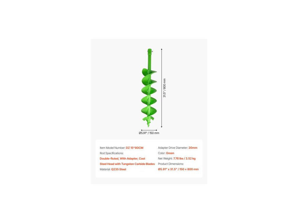 Průměr adaptéru: 20 mm,Specifikace tyče: Dvoubřitý, s adaptérem, Hlava z lité oceli s čepelemi z karbidu wolframu,Barva: Zelená,Číslo modelu položky: DZ 15*80CM,Materiál: Ocel Q235,Rozměry výrobku: Ø5,91" x 31,5" / 150 x 800 mm,Čistá hmotnost: 7,76 lbs / 3,52 kg
