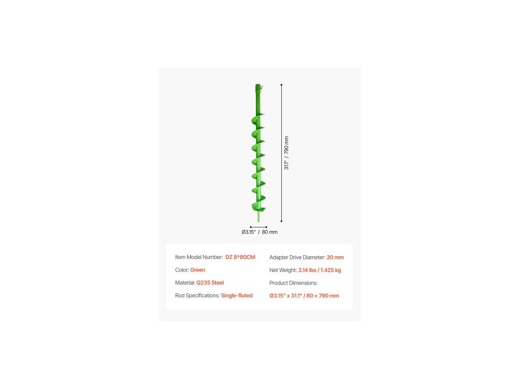 vrták do šneku pro sázení, spirálový vrták 80 x 790 mm, kompatibilní s vrtáky s vnitřním průměrem 20 mm, nástroj pro sázení cibulovin, příslušenství pro vrtání otvorů pro zahradní plot