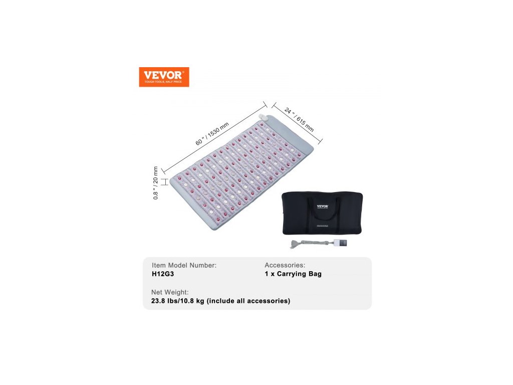 Číslo modelu položky: H12G3, Čistá hmotnost: 23,8 lbs/10,8 kg (včetně veškerého příslušenství), Rozměry výrobku: 60 x 24 x 0,8 palce / 1530 x 615 x 20 mm