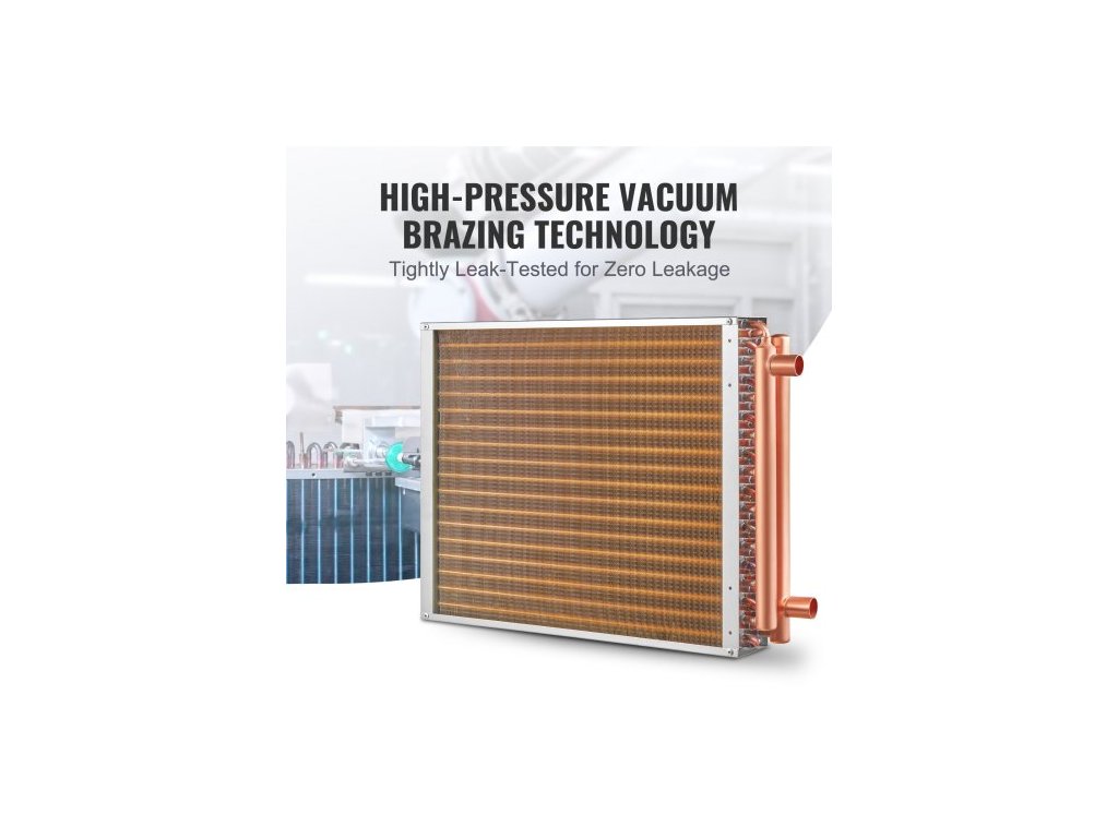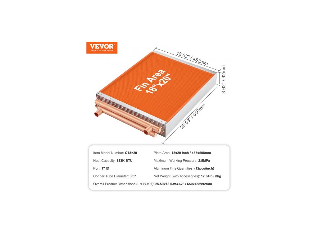 Provozní teplota: -40 °C-180 °C / -40 °F -356 °F,Hlavní materiály: Měď,Maximální provozní tlak: 2,5 MPa,Plocha desky: 18 x 20 palců / 45,72 x 50,8 cm,Tepelná kapacita: ≥133 K BTU,Počet hliníkových žeber: 242 ks,Barva: Zlatá,Model: C18×20,Počet měděných trubek: 3 řady 3/8",Rozměry produktu (D x Š x V): 25,59 x 18,03 x 3,62" / 650 x 458 x 92 mm, Čistá hmotnost (s příslušenstvím): 17,64 lb / 8 kg