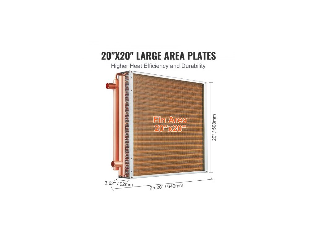 Provozní teplota: -40 °C-180 °C / -40 °F -356 °F,Hlavní materiály: Měď,Maximální provozní tlak: 2,5 MPa,Plocha desky: 20 x 20 palců / 50,8 x 50,8 cm,Tepelná kapacita: 160 K BTU,Počet hliníkových žeber: 242 ks,Barva: Zlatá,Model: C20×20,Počet měděných trubek: 3 řady 3/8",Rozměry produktu (D x Š x V): 25,20 x 20 x 3,62" / 640 x 508 x 92 mm, Čistá hmotnost (s příslušenstvím): 19,14 lb / 8,68 kg