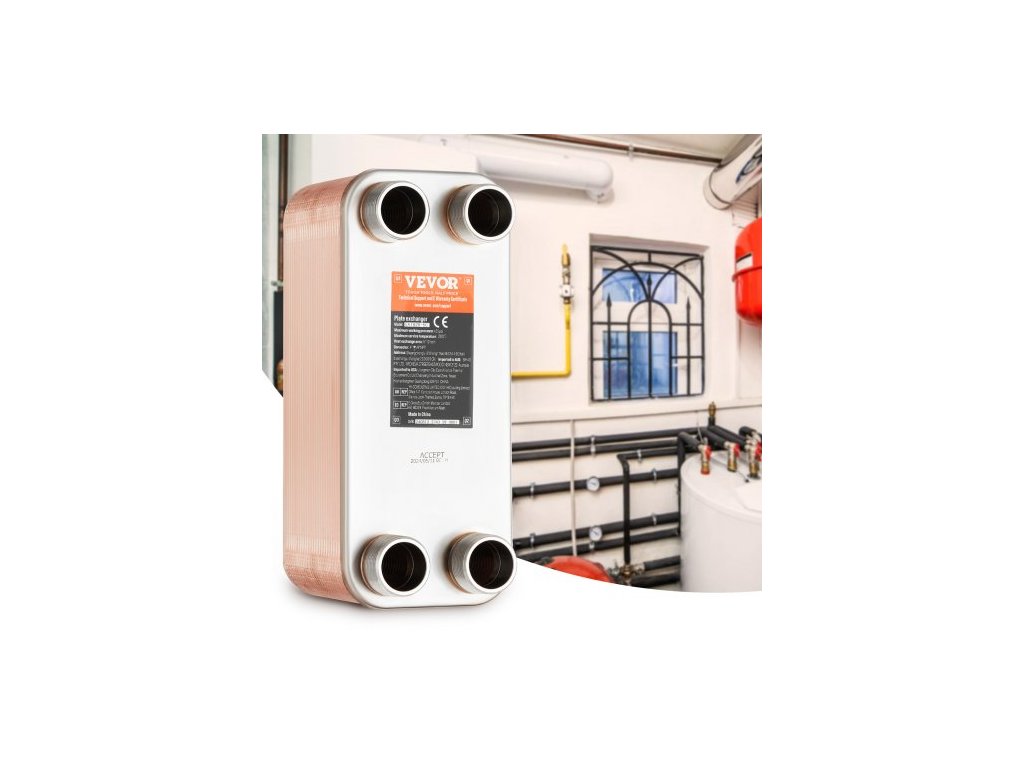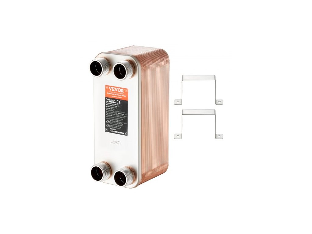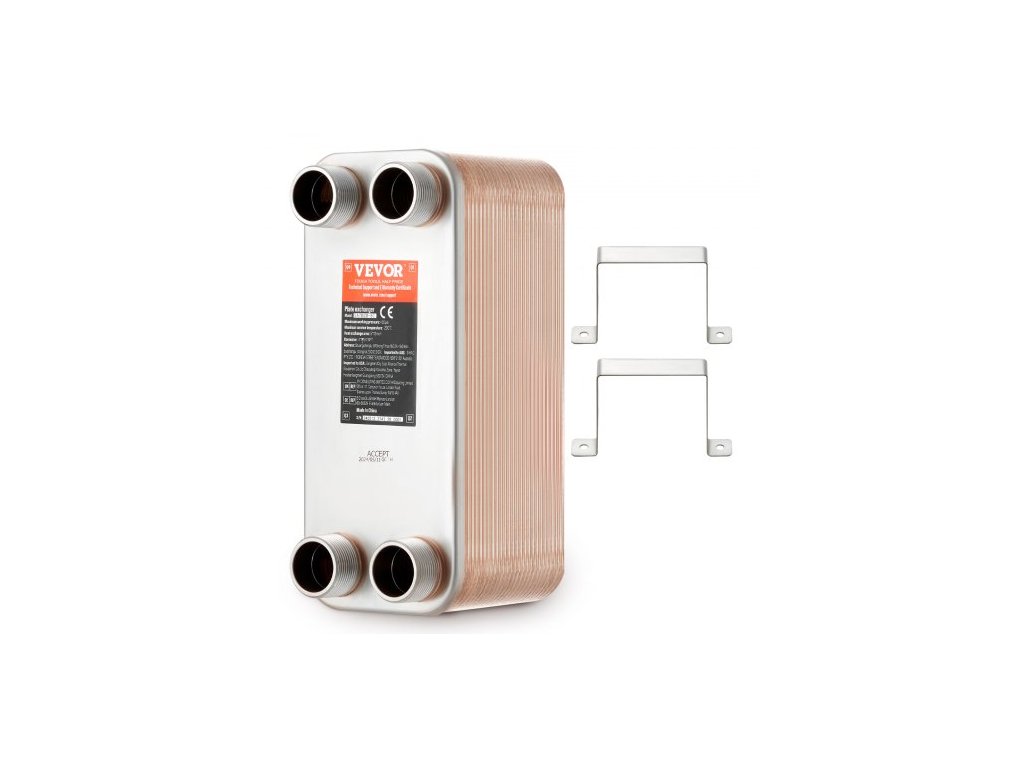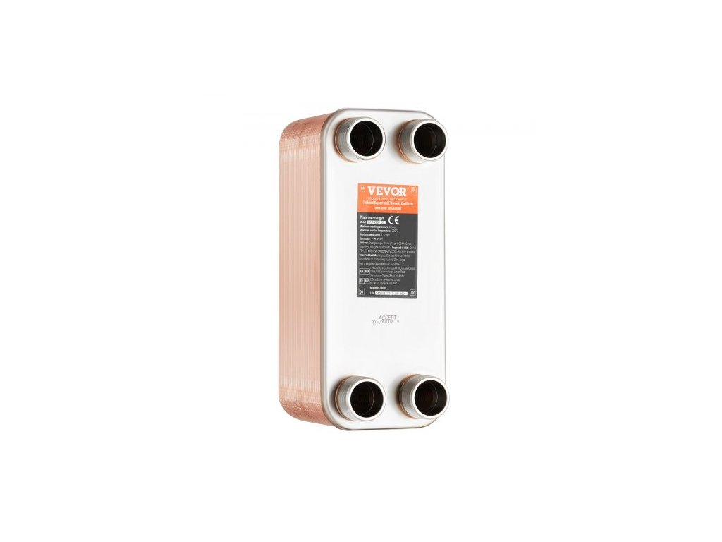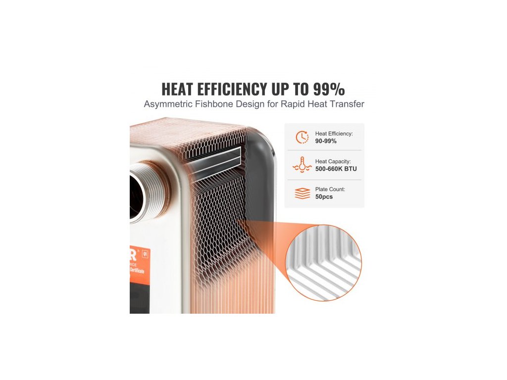 Plocha desek: 5x12 palců/ 127x305 mm, Tepelná kapacita: 500-660K BTU, Port: 4*1-1/4" MNPT vnější závit, Barva: nerezová ocel + měď, Model: EATB28-50, Tepelná účinnost: 90~99 %, Materiál: nerezová ocel 304/316, Pájení: 99,9% měděné pájení, Množství desek (ks): 50, Rozměry produktu (D x Š x V): 11,85 x 4,96 x 6,18" / 301 x 126 x 157 mm, Čistá hmotnost (s příslušenstvím): 18,78 lb / 8,52 kg