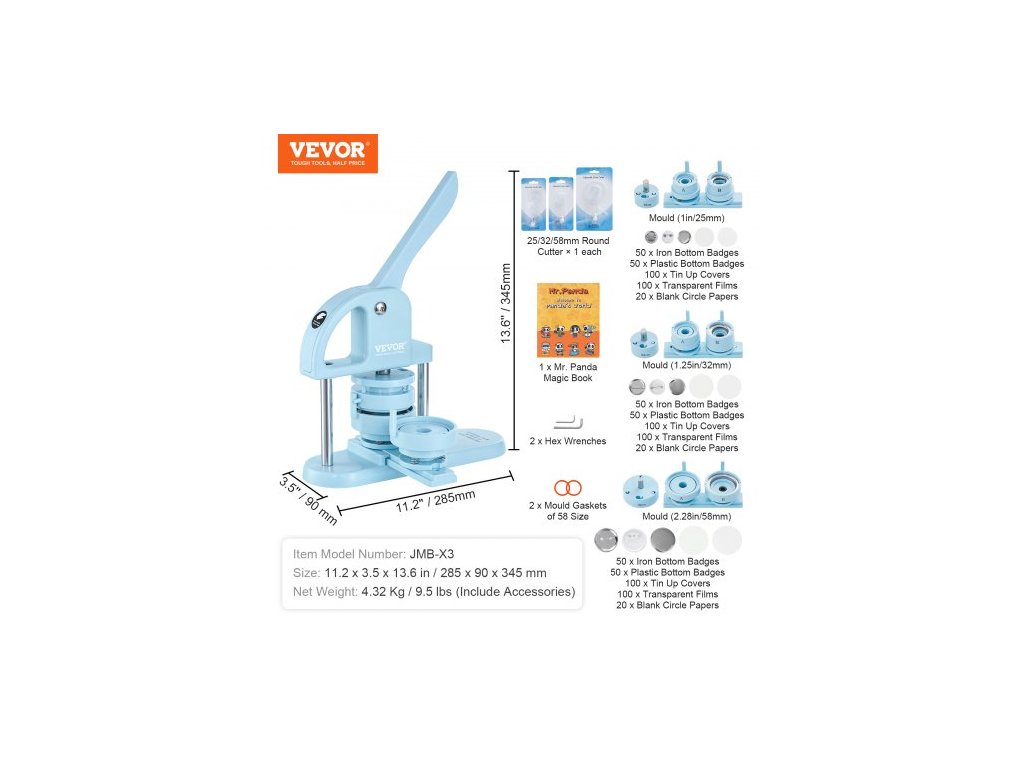 Průměr raznice: 0,98/1,25/2,28 palce (25/32/58 mm),Rozměr: 11,2 x 3,5 x 13,6 palce / 28,5 x 9 x 34,5 cm,Barva: Modrá,Číslo modelu položky: JMB-X3,Materiál: Plast,Čistá hmotnost: 4,32 kg/9,5 lbs (včetně příslušenství)