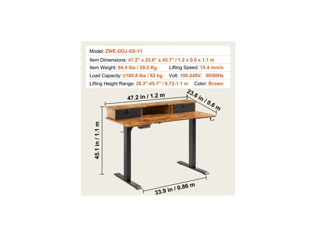 Rychlost zdvihu: 15,4 mm/s,Rozměry pracovní desky: 47,2'' x 23,6'' / 1,2 x 0,6 m,Nosnost: ≥180 lbs / 82 kg,Barva: Hnědá,Model: ZWE-DDJ-SS-11,Napětí: 100-240V,50/60Hz,Rozsah výšky zdvihu: 28,3''-45,1'' / 0,72-1,1 m,Hmotnost položky: 64,4 lbs / 29,2 kg