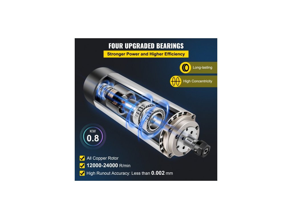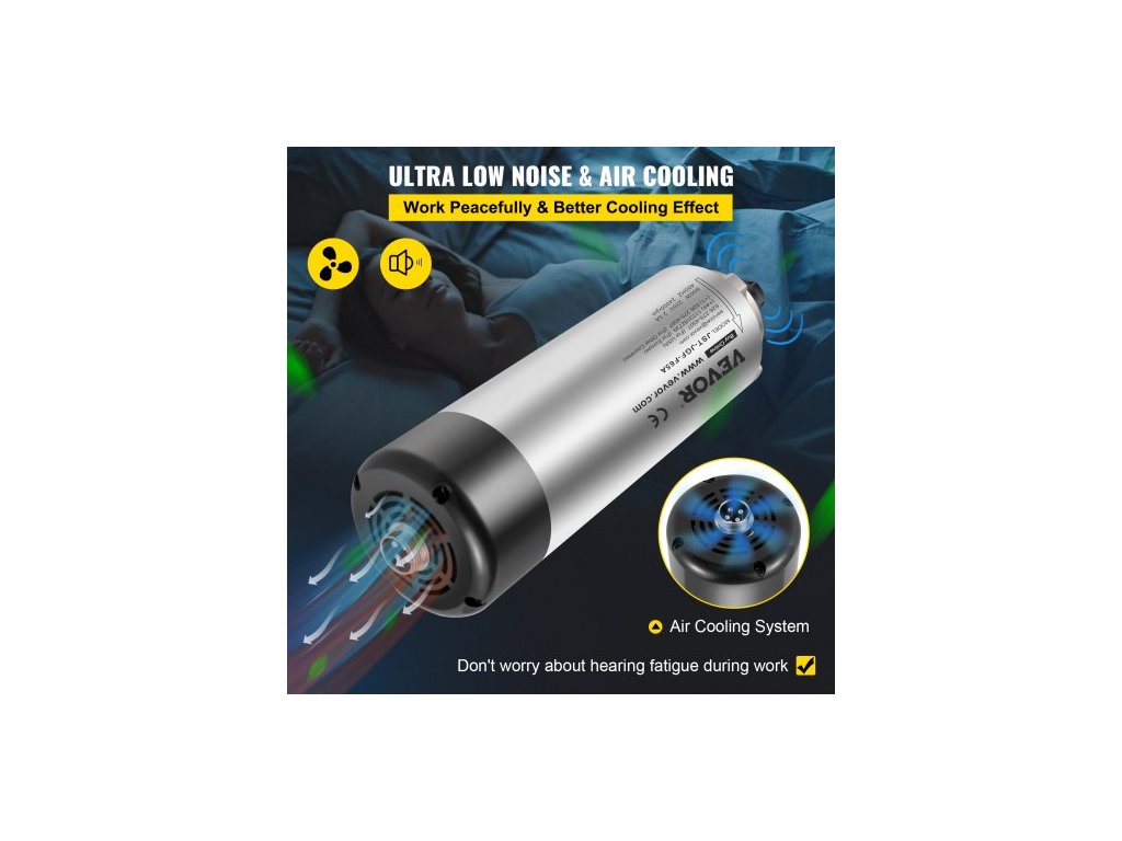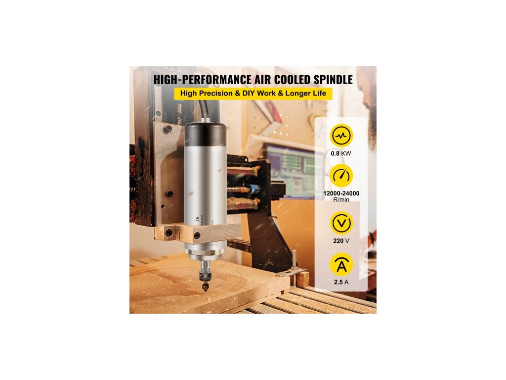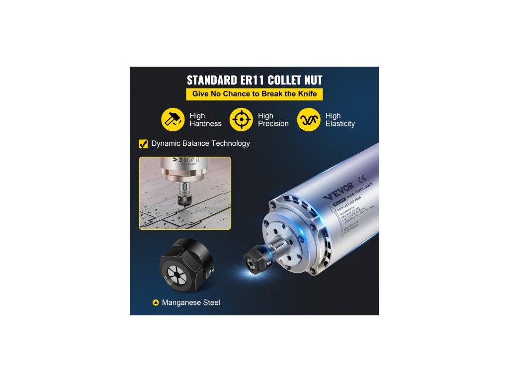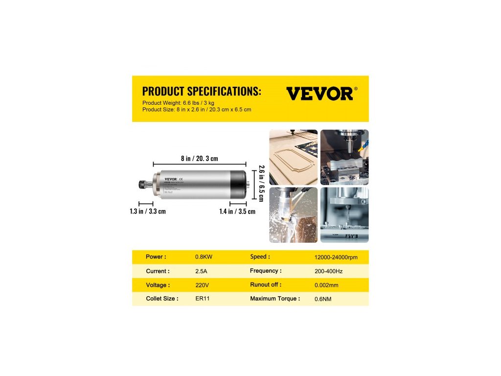 Otáčky: 0–24 000 ot./min,Hrubá hmotnost: 2,7 kg (5,95 liber):,Kleštinové sklíčidlo ER11: (3,175 mm, 4 mm, 6 mm),Napětí: 220 V~250 V (Máme také skladem položku 110 V~120 V pro země jako USA a Kanada. Kontaktujte nás ohledně skladových zásob),Frekvence: 400 Hz,Házení: menší než 0,005 mm,Specifikace: 65 x 180 mm (Průměr: 65 mm x Délka: 180 mm),Výkon: 0,8 kW Rozměry (přibližné): 25 cm D x 7,5 cm Š