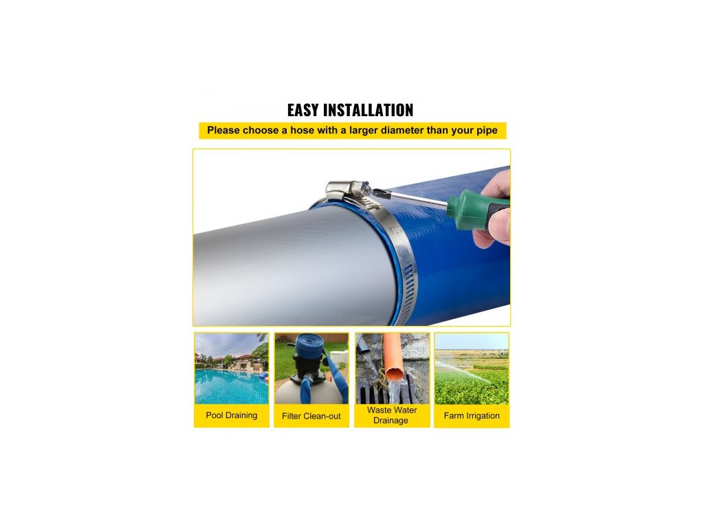 Šířka ploché hadice: 2,5 palce / 63 mm,Délka hadice: 105 stop / 32 m,Provozní tlak: 60 psi,Barva: Modrá,Model: SPDH-8736,Teplotní rozsah: 5 °F až 149 °F/-15 °C až 65 °C,Materiál: PVC,Hmotnost: 14 liber / 6,4 kg,Vnitřní průměr hadice: 1-1/2" / 38 mm