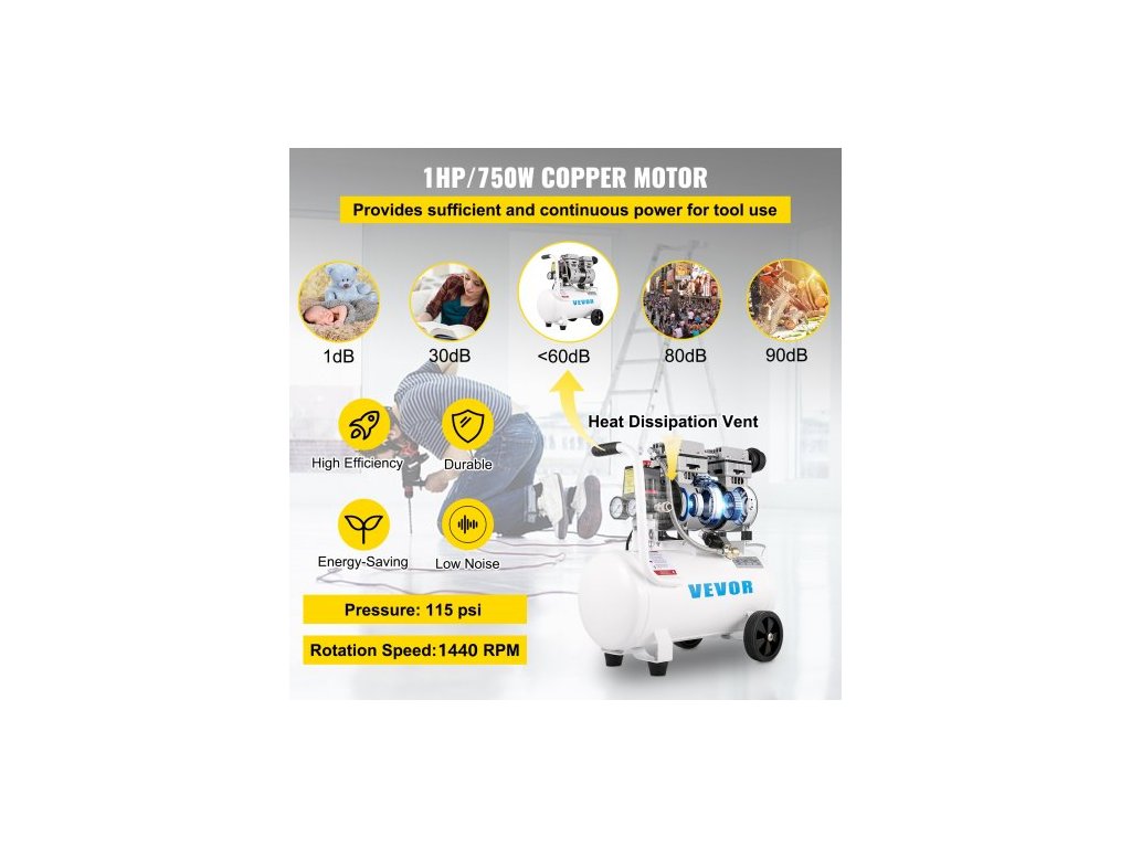 typ mazání: bezolejové, otáčky: 1760 ot./min, objem nádrže: 5,5 galonu (25 l), objem výfukových plynů: 165 l/min, hluk: 60 dB, napětí: 220 V 50 Hz 7 A, výkon: 750 W/1 HP, max. tlak: 115 psi