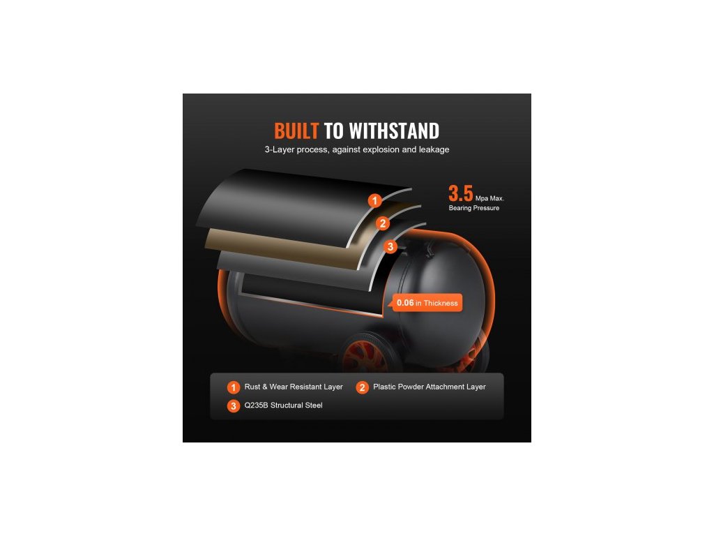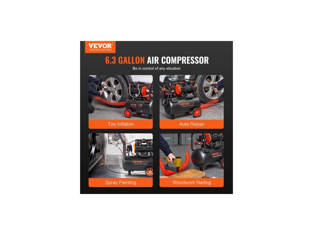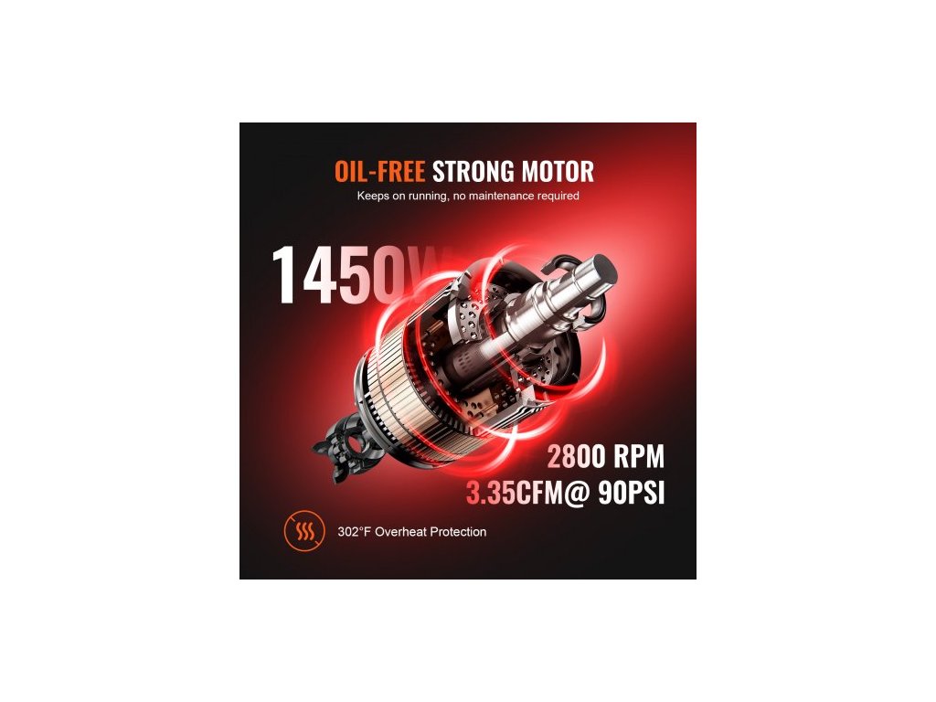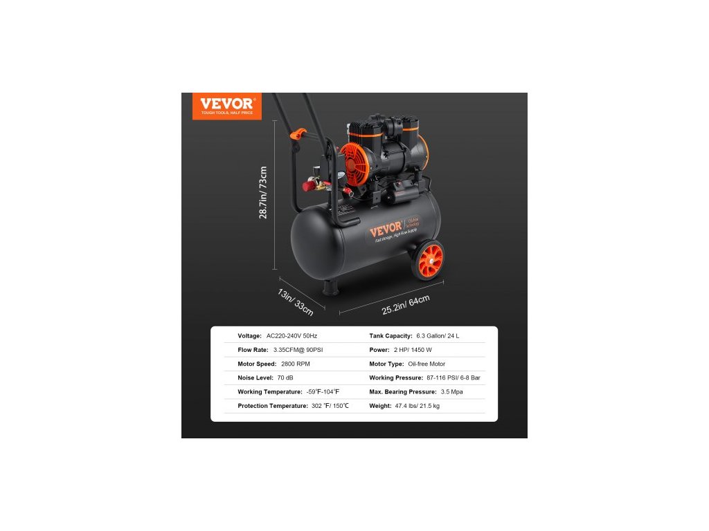Ochranná teplota: 302 ℉ / 150 ℃,Hmotnost: 47,4 lbs / 21,5 kg,Rozměry produktu: 25,2 x 13 x 28,7 palců / 64 × 33 × 73 cm,Hladina hluku: 70 dB,Průtok: 3,35 CFM při 90 PSI,Objem nádrže: 6,3 galonu / 24 l,Otáčky motoru: 2800 ot./min,Provozní tlak: 87-116 PSI / 6-8 barů,Maximální tlak v ložisku: 3,5 MPa, Napětí: AC 220-240 V 50 Hz, Typ motoru: Bezolejový motor, Provozní teplota: -59℉-104℉, Výkon: 2 HP / 1450 W