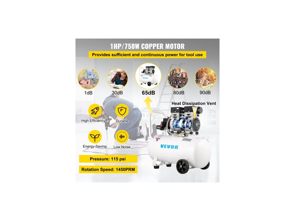 Vzduchový kompresor 41,6 l, ultra tichý vzduchový kompresor 1 HP, bezolejový vzduchový kompresor s ocelovou nádrží 750 W, přenosný vzduchový kompresor 8 barů, ultra tichý kompresor pro domácí opravy, huštění pneumatikobjem 50 l a bezolejové čerpadlo